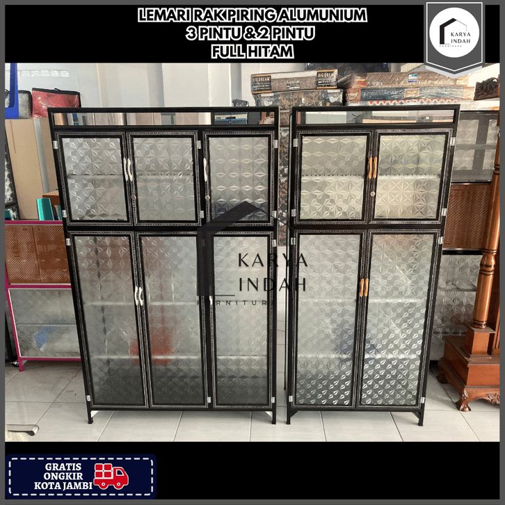 Lemari Rak Piring Dapur ALUMUNIUM 2 / 3 Pintu FULL HITAM Kaca Polos Roda Alumunium