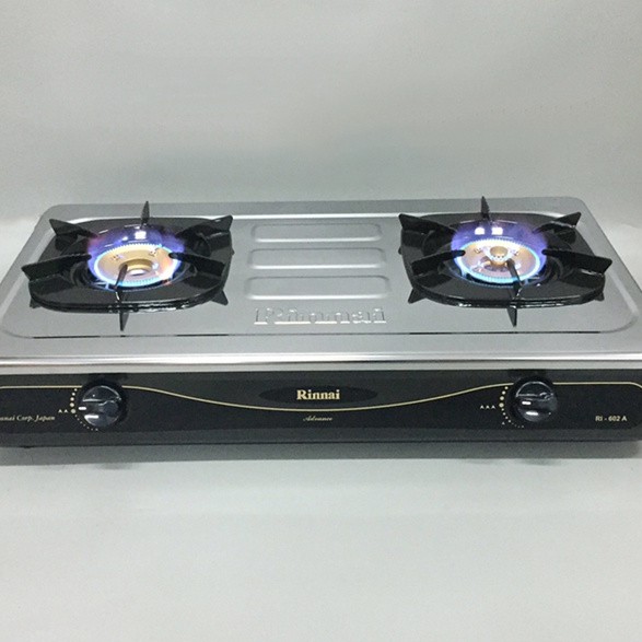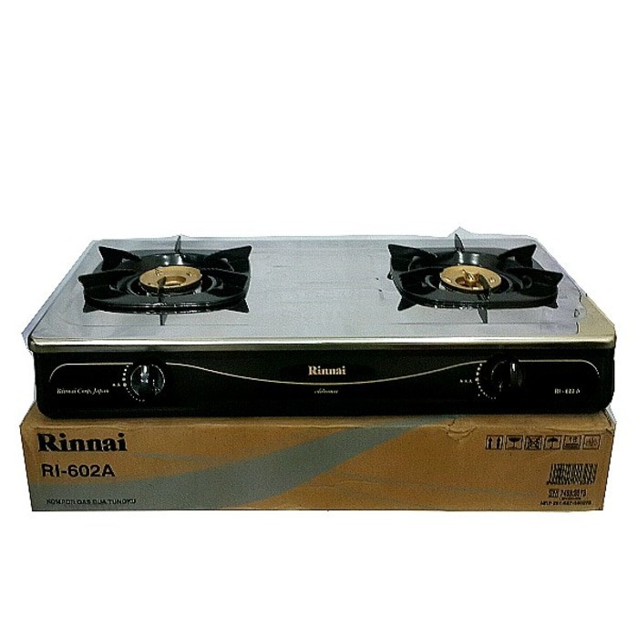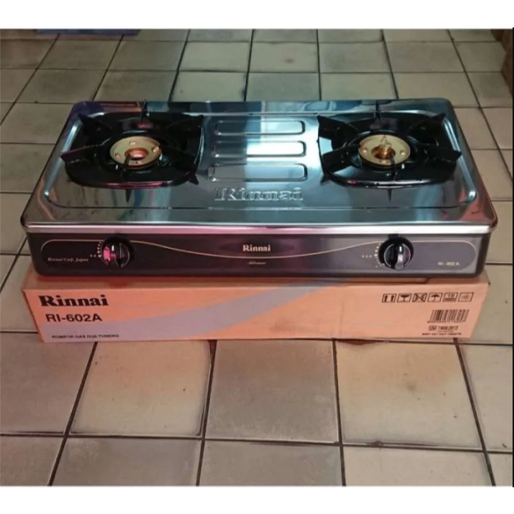 KOMPOR GAS RINNAI RI 602A 2 TUNGKU STAINLESS STEEL TEMPERED GLASS API BESAR ORIGINAL SNI