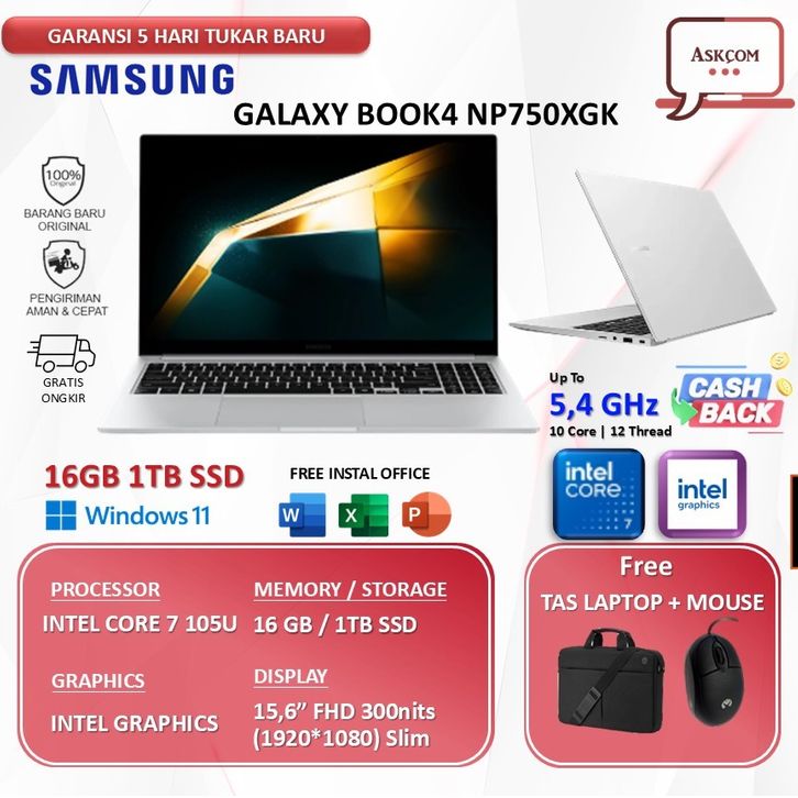 Laptop Samsung Galaxy Book4 Intel Core 7 105U 16GB 1TB SSD W11PRO 15.6"FHD Windows11 -NP750XGK