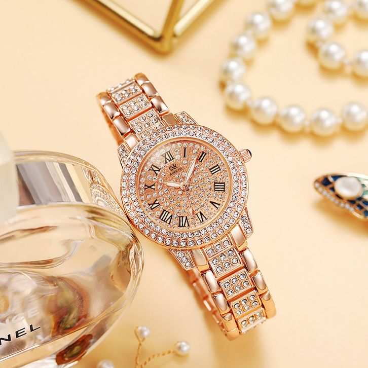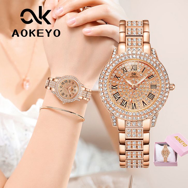 Jam Tangan Wanita Diamond Rose Gold Analog Fashion Casual Women Strap Steel Quartz Watch Tahan Air AOKEYO F008