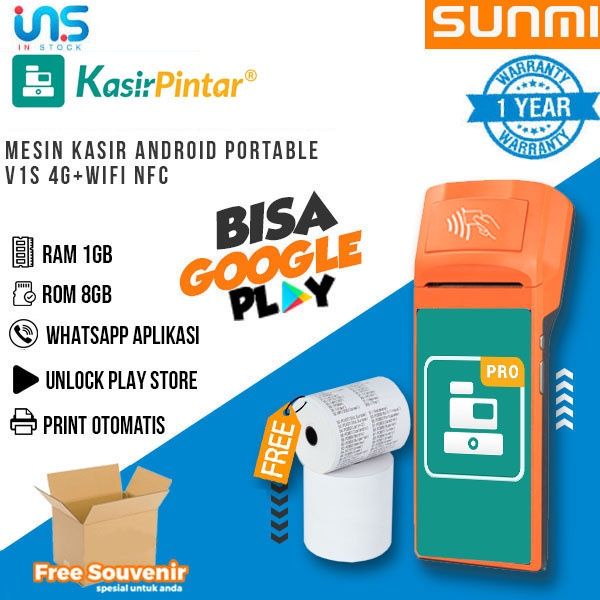 Smart Mesin Kasir Original MESIN KASIR ANDROID SUNMI V1s 3G WIFI NFC 1/8GB Open Play Store