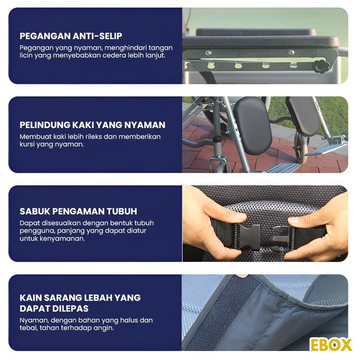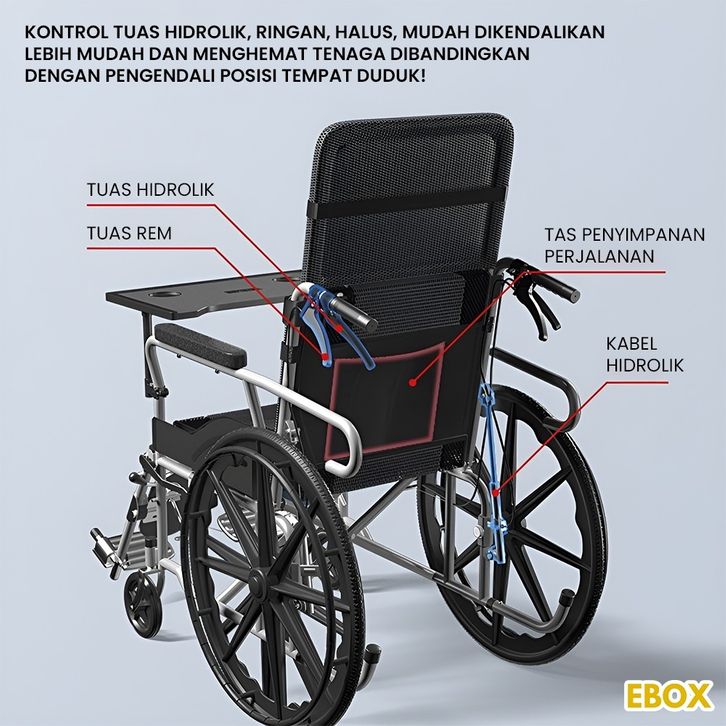 Kursi Roda Hidrolik EBOX 24 Inch, Sandaran Rebah 180° + Meja Portabel & Baskom Pispot