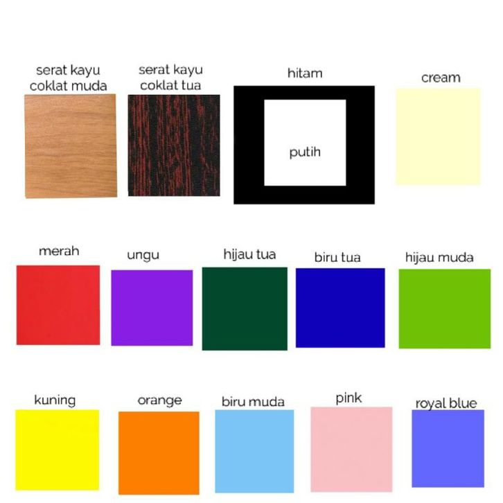 Hitam , Putih , merah, pink, biru, hijau , kuning, ungu, SeratKayu CoklatMuda, SeratKayu CoklatTua, orange