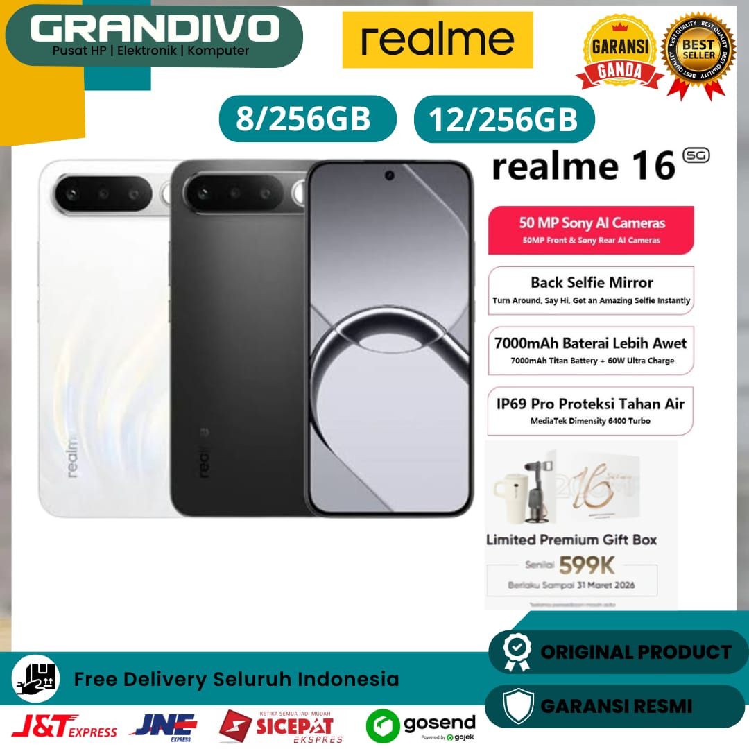 FREE GIFT Realme 16 5G 8/256GB 12/256GB 50MP Front & Sony Rear AI Cameras Garansi Resmi - Grandivo
