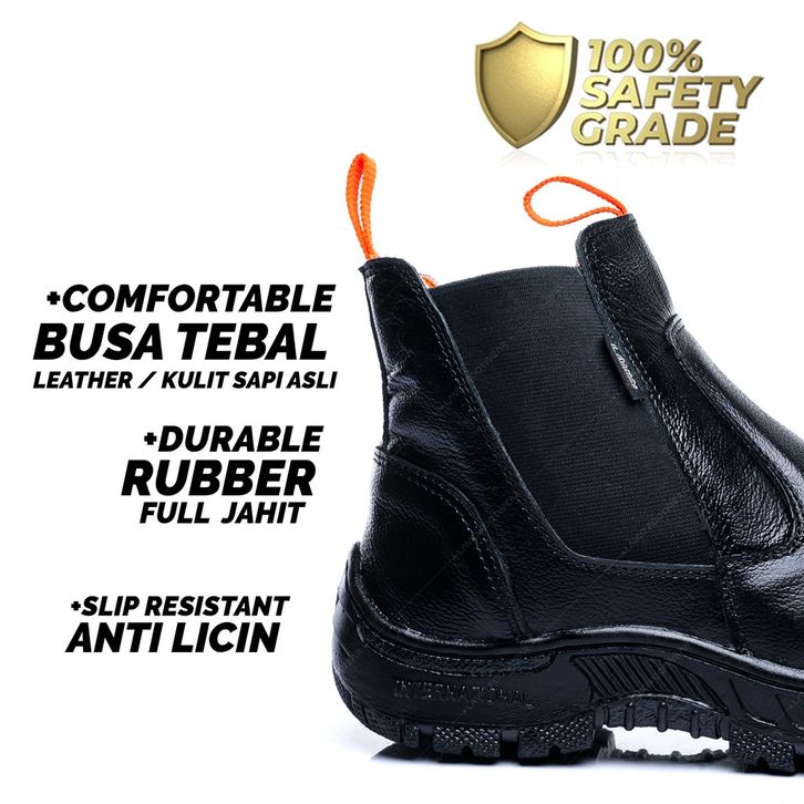 BROTRHER Sepatu Safety Proyek bangunan Kitchen Boots Hitam Viora Slop Ujung Besi Kulit Asli Waterproof