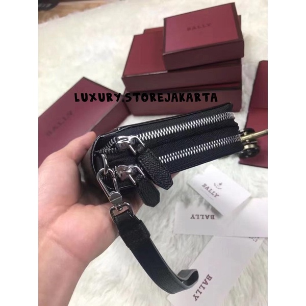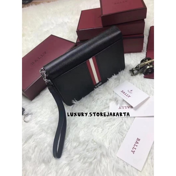 [LENGKAP BOX BALLY] CLUTCH BALLY WALLET MEN ZIP TRAVEL BLACK STRIPE RED ORIGINAL