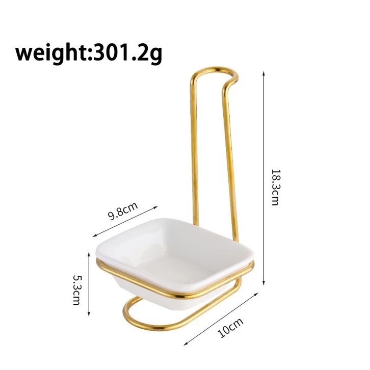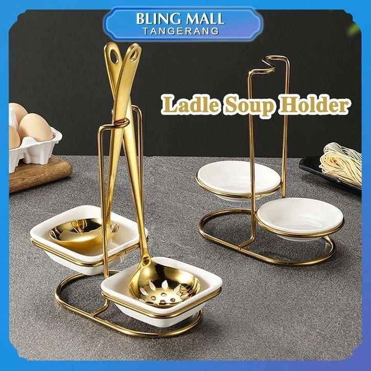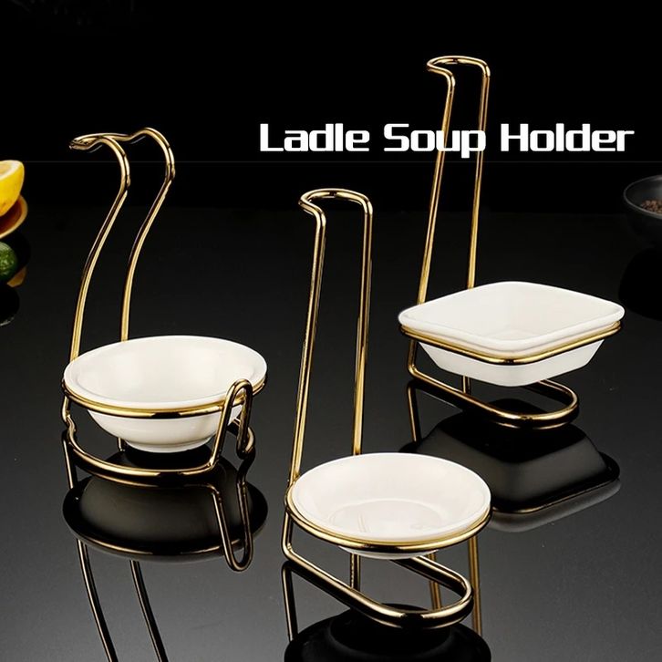 Ladle Soup Holder / Ladle Stand Spoon Holder Sendok Sup Berdiri Stainless Emas dengan Mangkuk Keramik