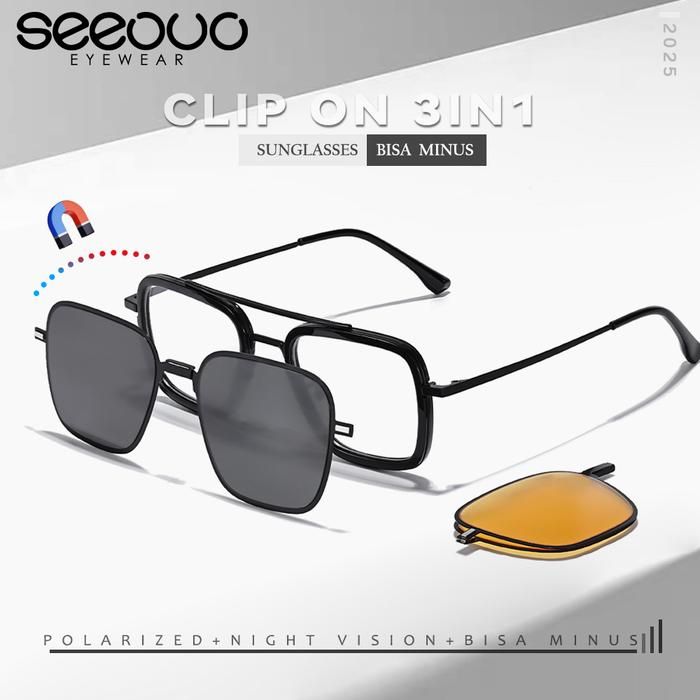 Kacamata Pria Wanita // Kacamata Clip On 3in 1 Tony Stark Free 2 Lens Polarized Bahan Metal Kotak Bisa Minus // Terlaris