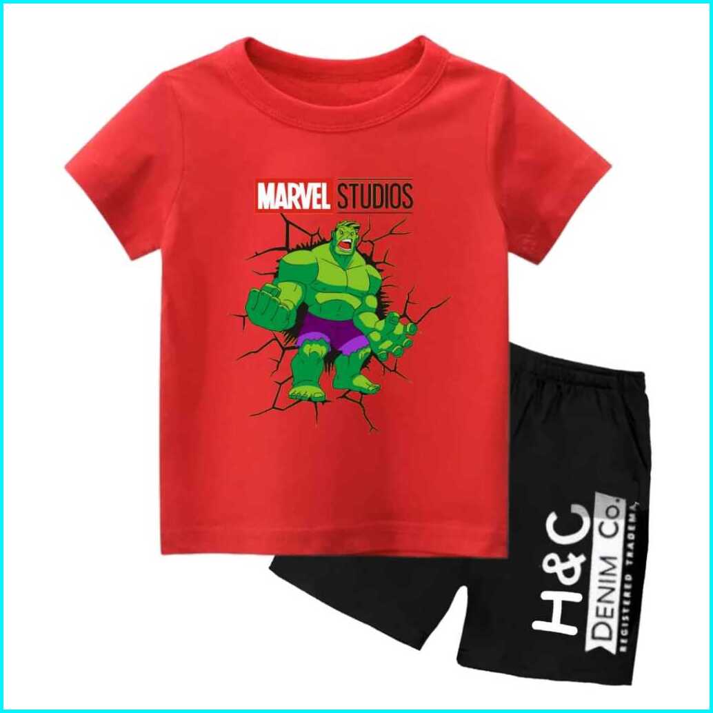 Setelan Pendek Baju Kaos Anak Laki Set Lengan Pendek Anak Cow Motif Hulk Berwarna