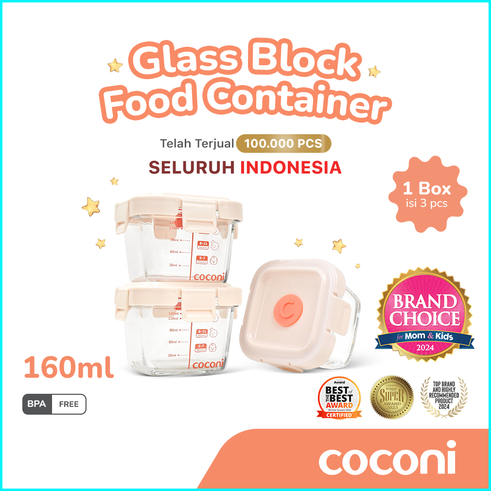 Coconi Baby Food Glass Container 3 Pcs X 160ml Wadah Penyimpanan Makan Kaca Anak Mpasi Kedap Udara Tahan Panas Isi 3 Pcs
