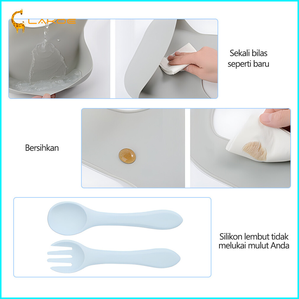 Lakoeofficialmall 5pcs Free Box Peralatan Makan Bayi Set Celemek Makan Bayi Mangkok Sendok Anak Training Cup Bayi Silico