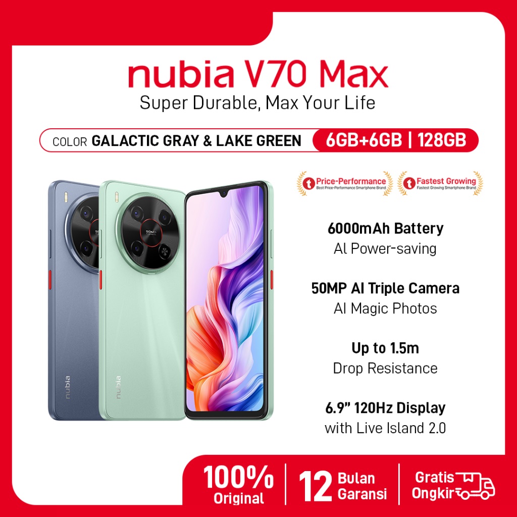 [Mall]Nubia V70 Max RAM 6GB+6GB ROM 128GB 6000mAh 22.5W Fast Charging 50MP AI Triple Camera Sleek Slim Body GaransiResmi