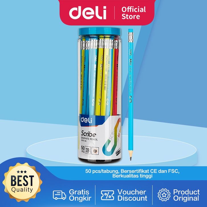 Deli Pensil 2B dengan penghapus 50 pcs/tabung sudah di raut EU51006