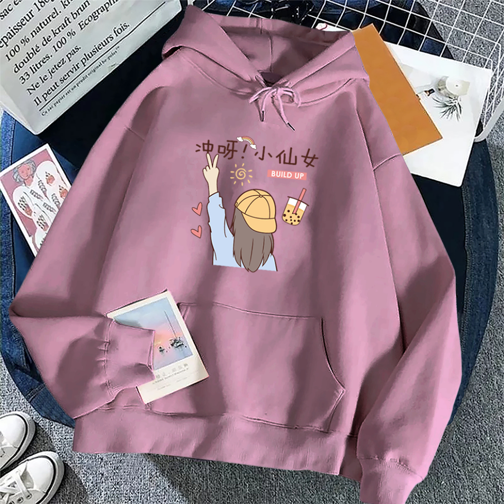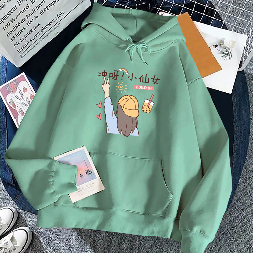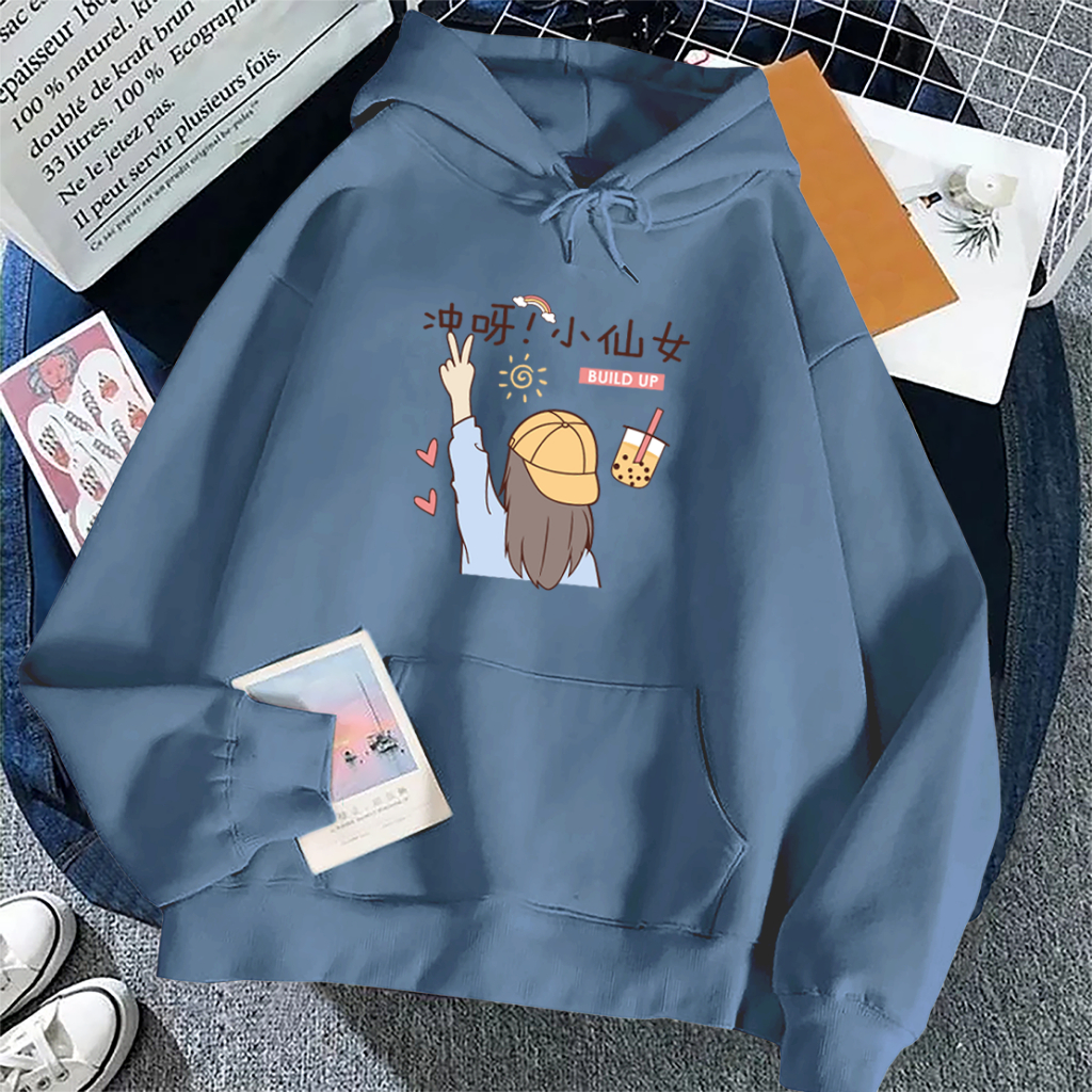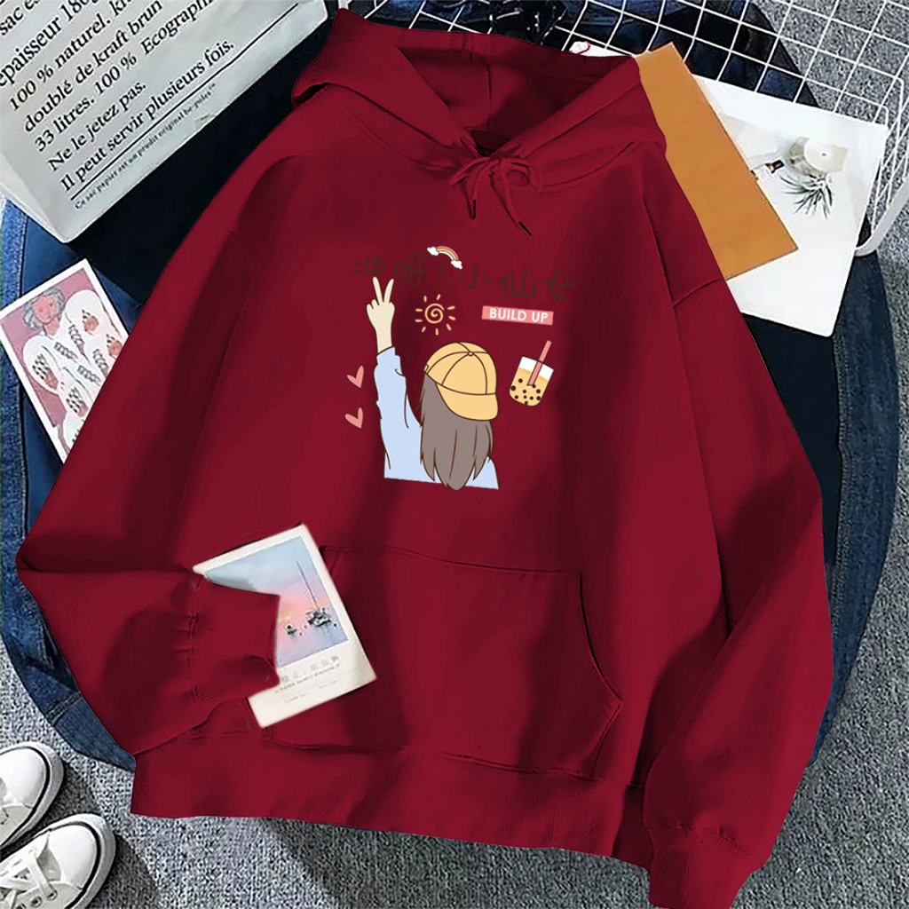 Sweater Hoodie Anak Perempuan BUILDUP Lengan Panjang Umur 5-15 Tahun Bahan Flecee
