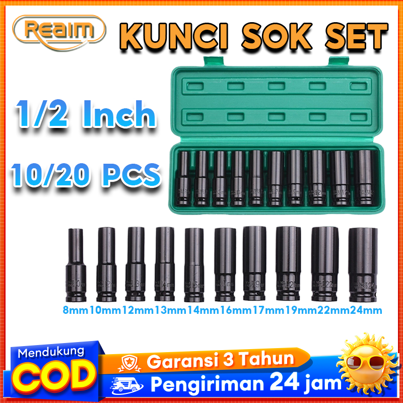 Reaim Kunci Sok Set Impact Extension Deep Impact Socket Set 10/20Pcs 1/2 Inch Gagang Sock