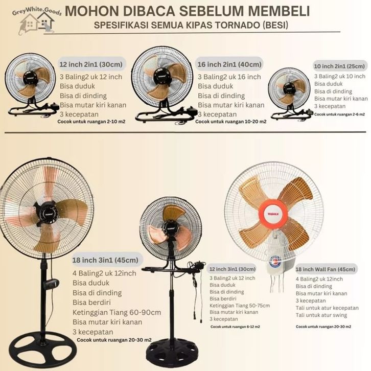10 inch 2in1, 12 inch 2in1, 12 inch 3in1, 16 inch 2in1, 18 inch 3in1, 18 inch wall fan