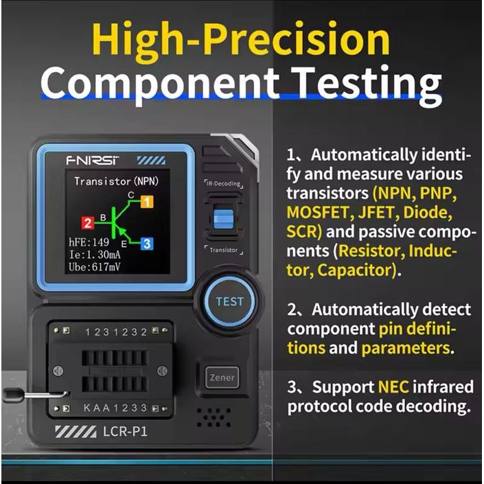 FNIRSI LCR-P1 TRANSISTOR TESTER CAPACITOR MULTI-FUNCTION ANTI-BURN DIODE TRANSISTOR LCR ESR NPN PNP MOSFET INFRARED TEST