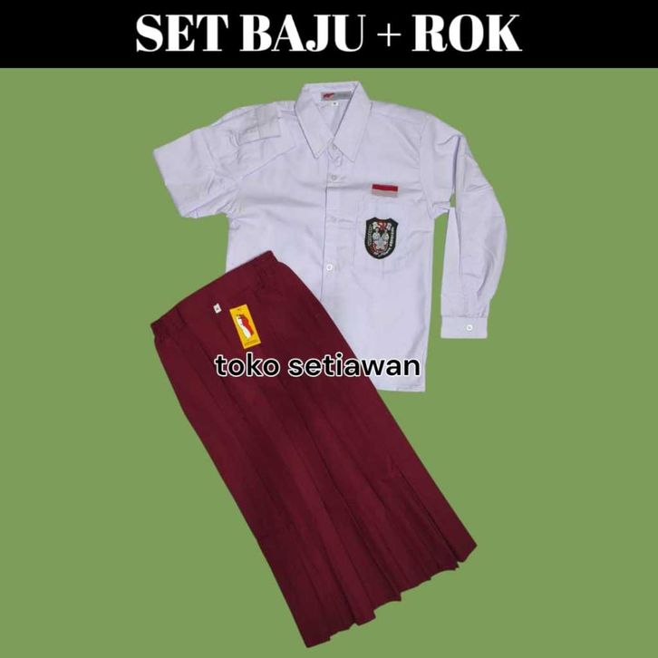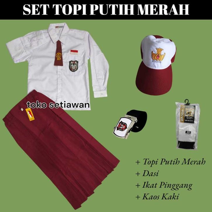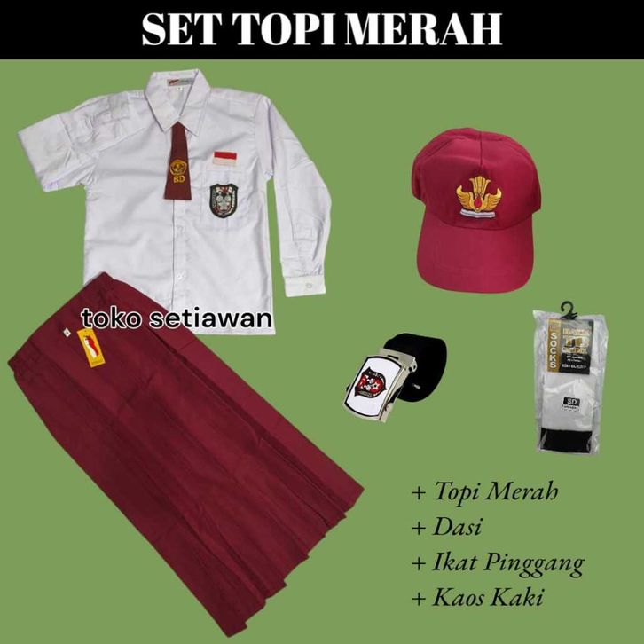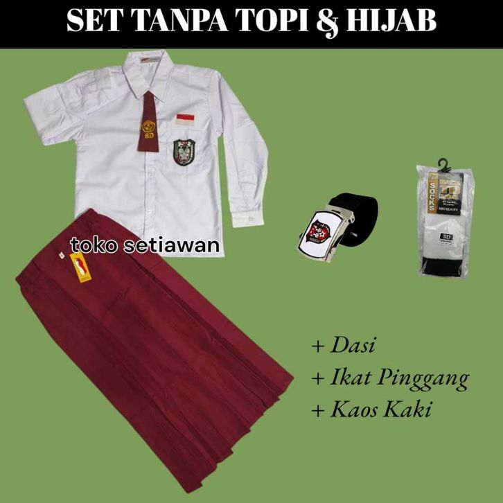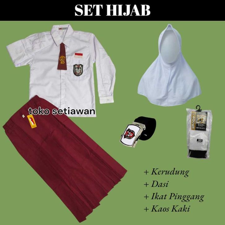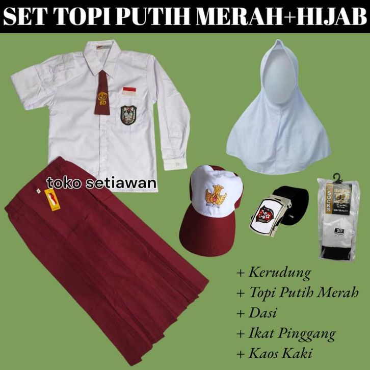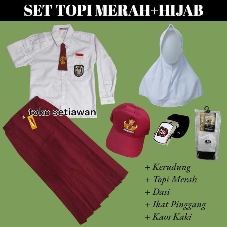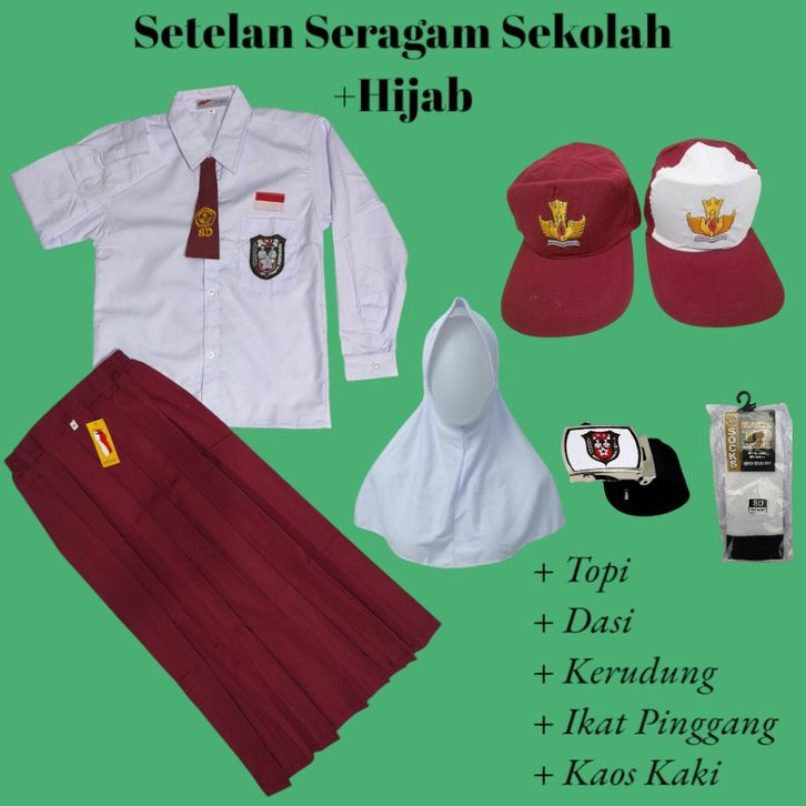 Setelan Seragam Sekolah SD Anak Perempuan Hijab Baju Putih Lengan Panjang Dan Rok Panjang Merah Lengkap Aksesoris Usia 5