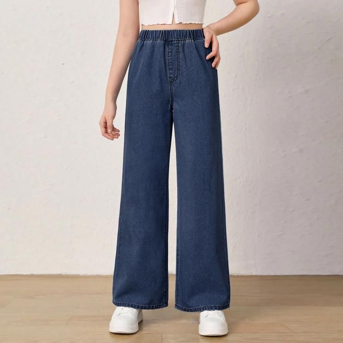 288# Celana Jeans Wanita Elastic Waistband Casual Solid Color Straight Ladies Baggy Denim Pants Panjang - DARK BLUE