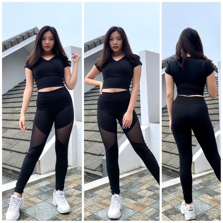 Setelan senam aerobik zumba yoga gym fitness model crop V-legging triangle