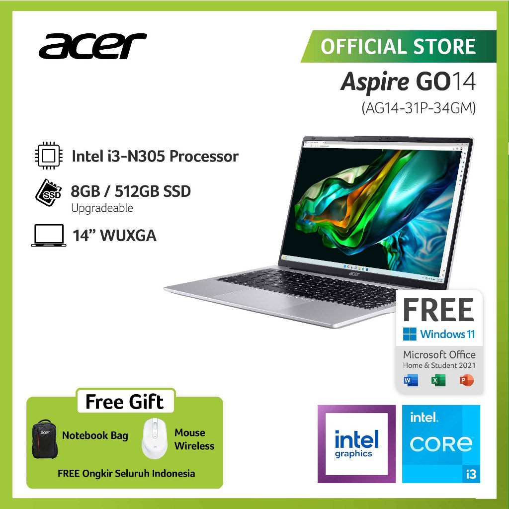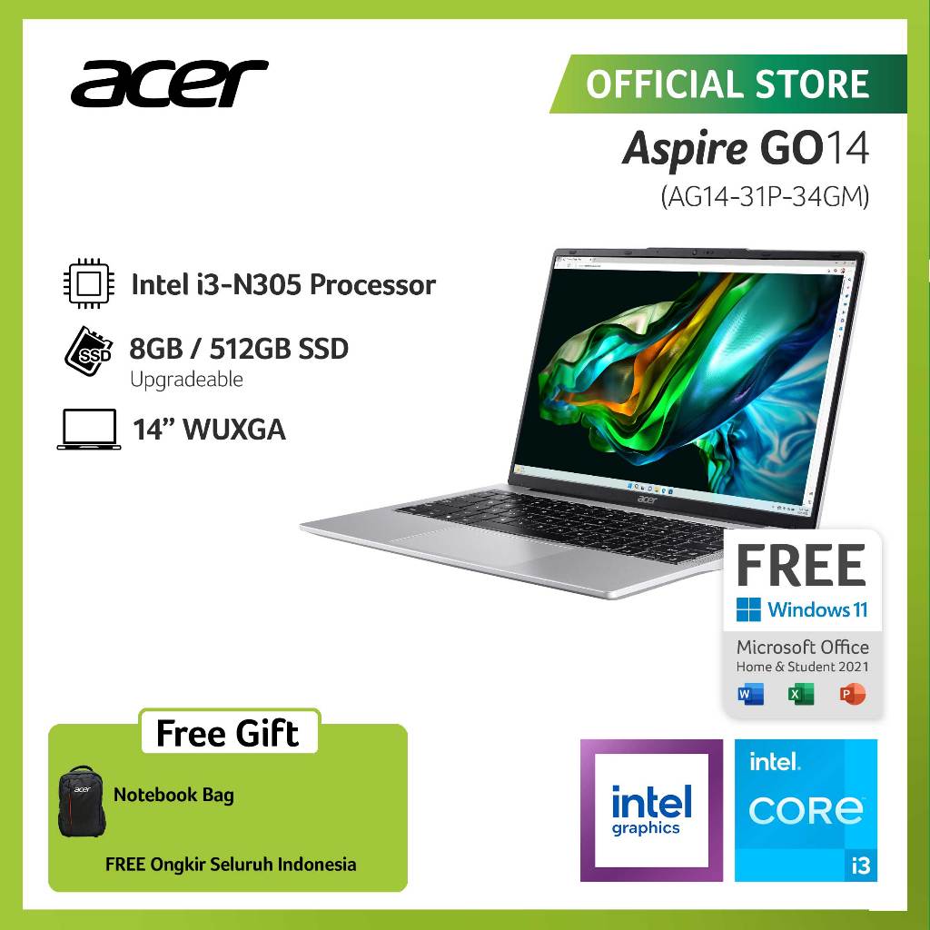PROMO (FREE MOUSE) ACER LAPTOP ASPIRE GO AG1431P34GM INTEL CORE I3N305 INTEL UHD GRAPHICS RAM 8GB STORAGE 512GB SSD