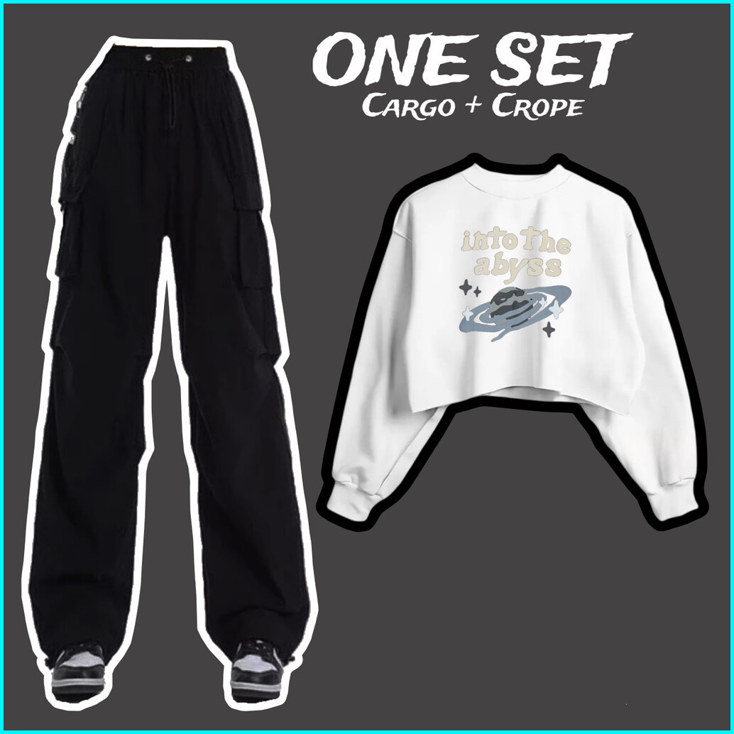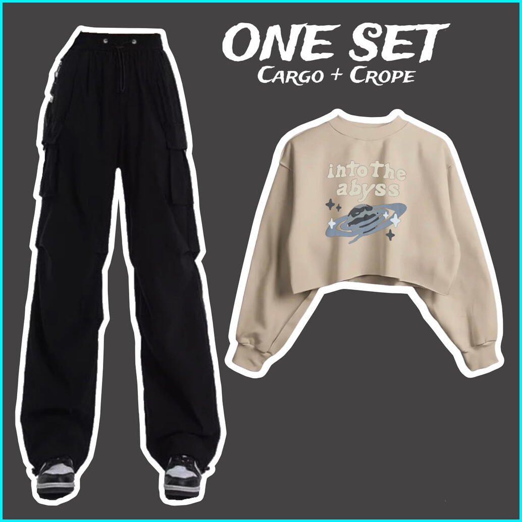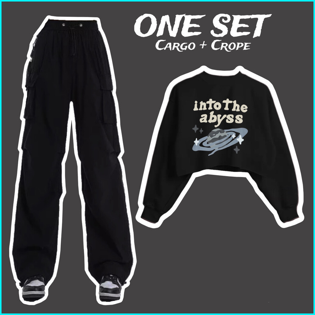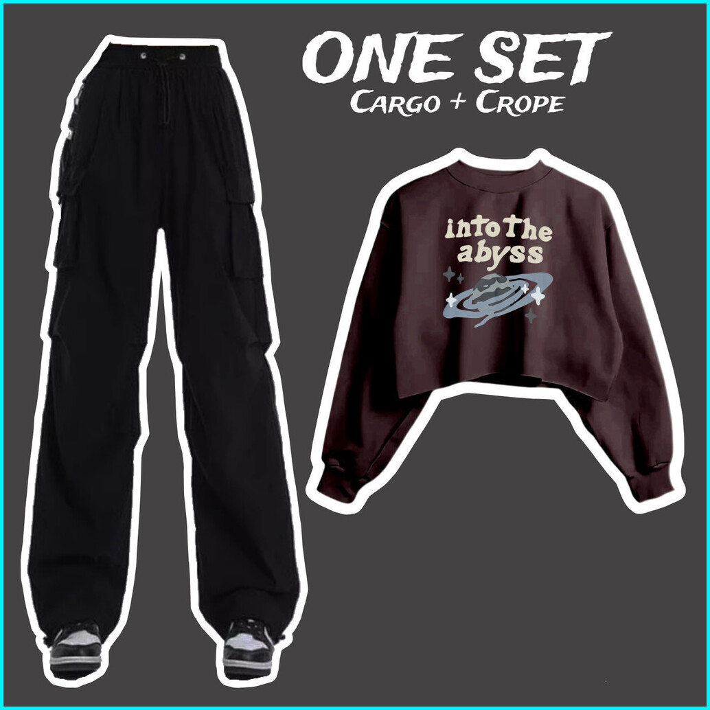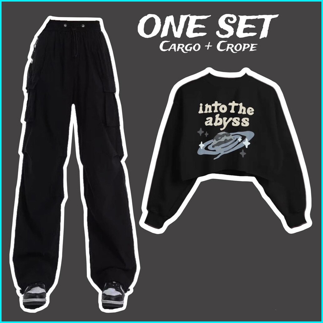 One Set Sweater Croptop Dan Celana Kargo Kekinian Motif Into The Abyss Bahan Fleece Atasan Baju