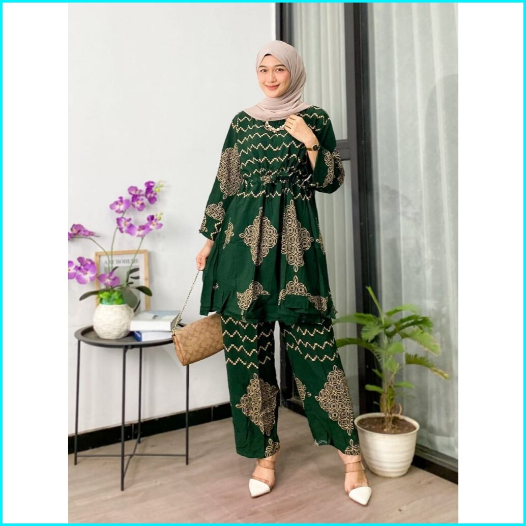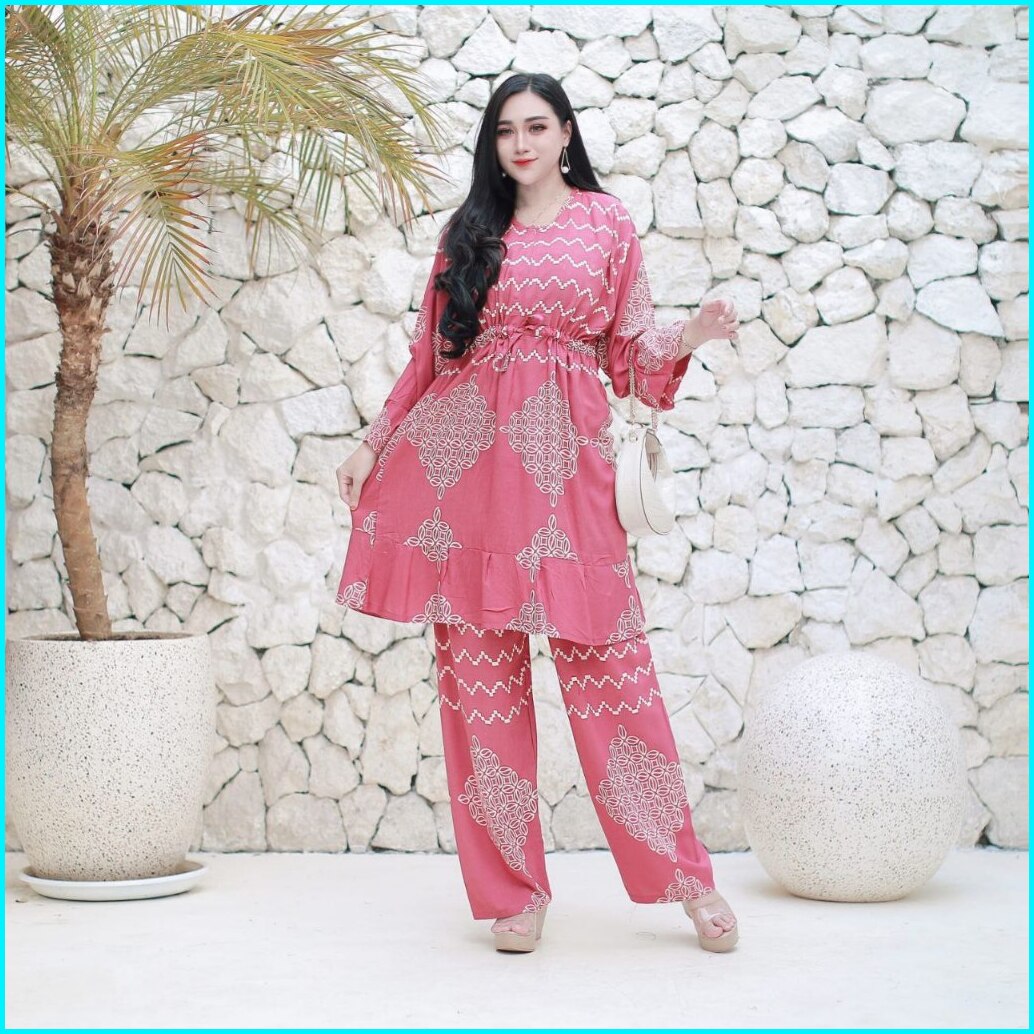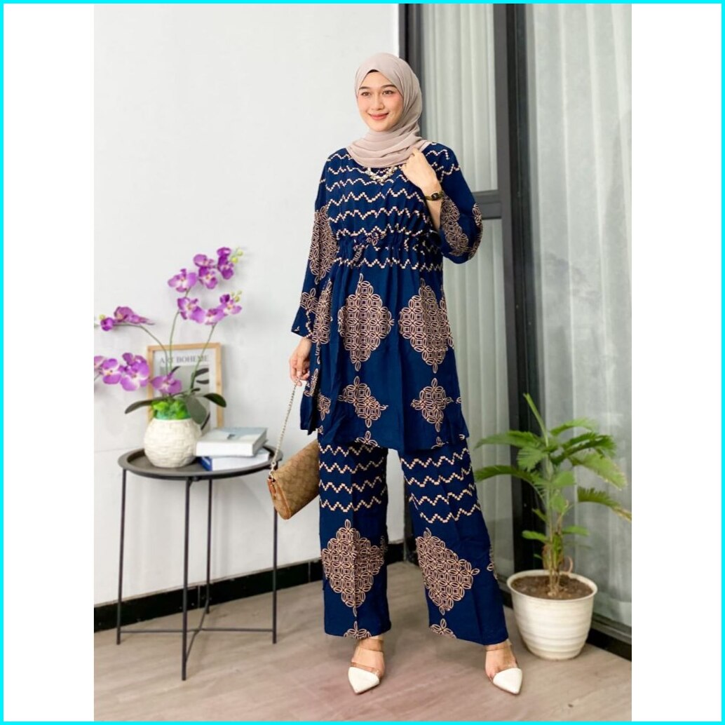 One Set Wanita Kekinian Jumbo Rayon Premium Busui Motif Sonya Tunik Wanita Setelan Celana Terbaru