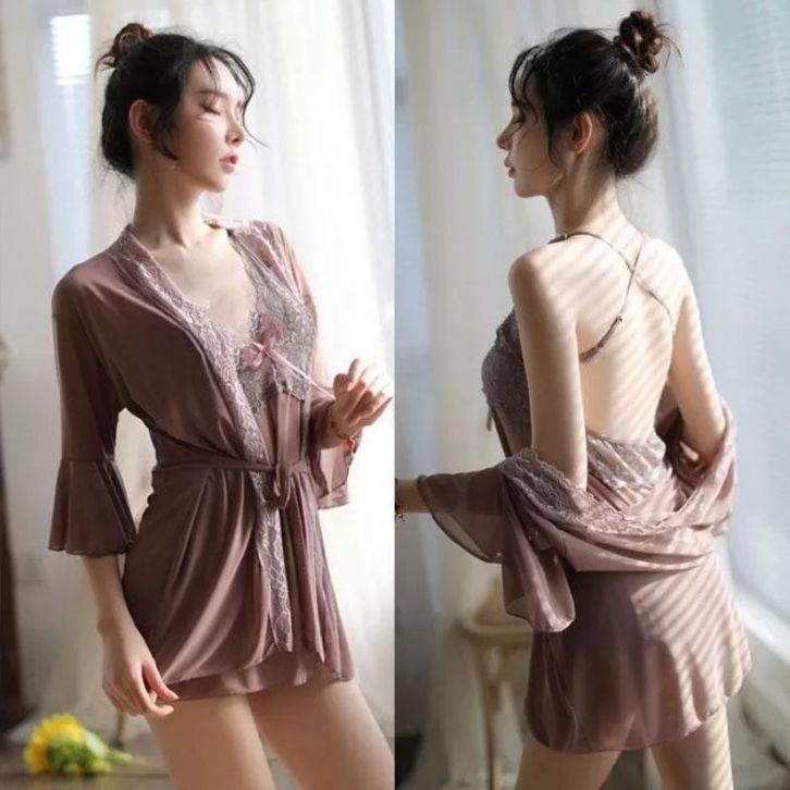 KIMONO + INNER LINGERIE 3IN1 MOTIF BUNGA COAT+SLING KK31 - LINGERIE SEKSI HOT TRANSPARAN - BAJU DINAS MALAM TERBARU