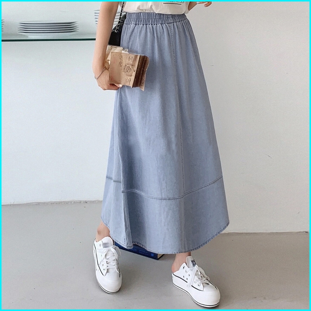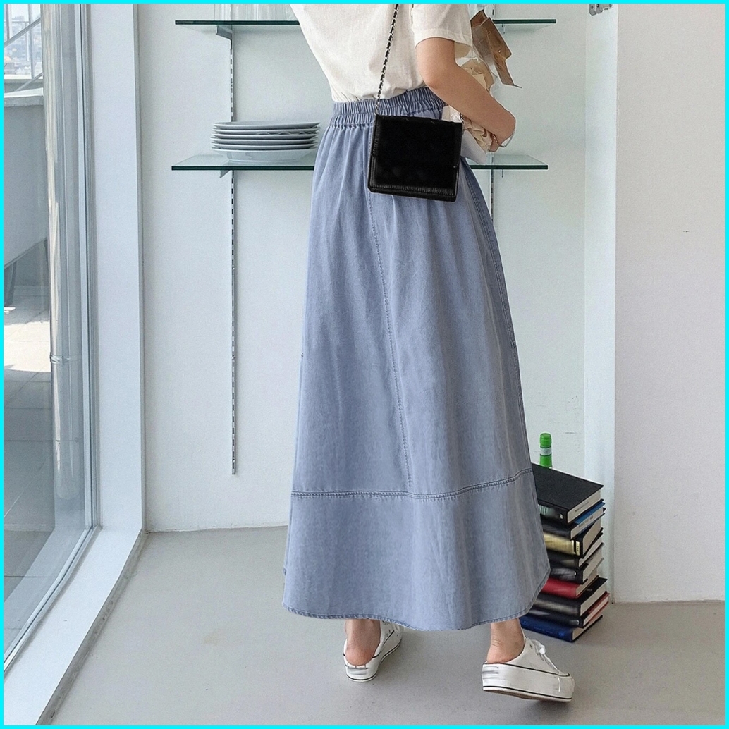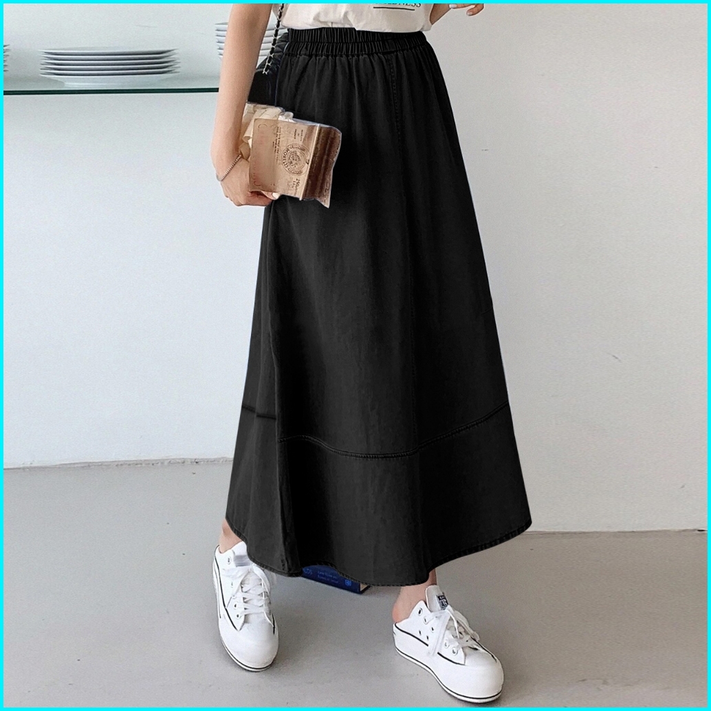 Denim Skirt Rok Wanita Summer Splicing High Waisted Loose Mid-length Elastic Waistline A-line Maxi Skirts