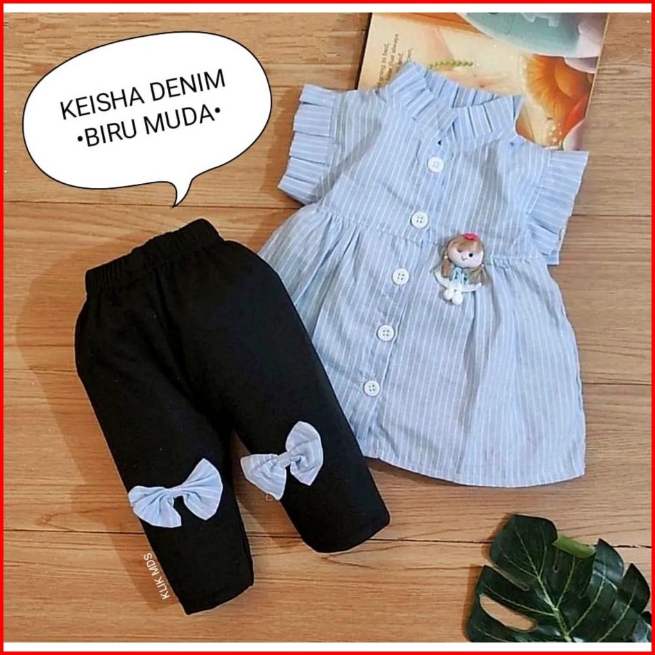 Setelan Baju Anak Perempuan Baju Bayi Cewek Atasan Lengan Pendek Dan Celana Panjang Motif Keisha Denim Usia 0-6 Bulan