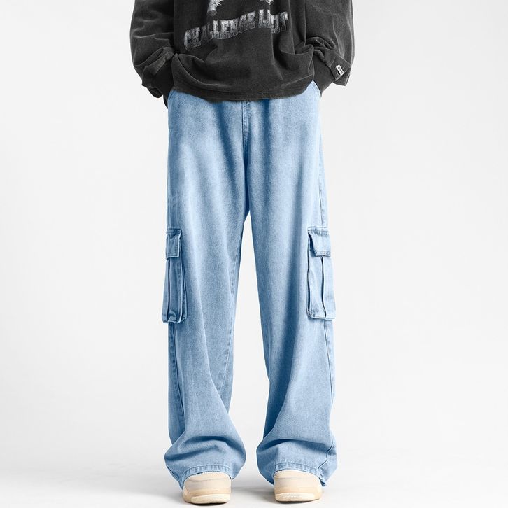 KeyBoy Celana jeans pria panjang cargo hitam baggy kulot dewasa cowok straight kargo denim korean style