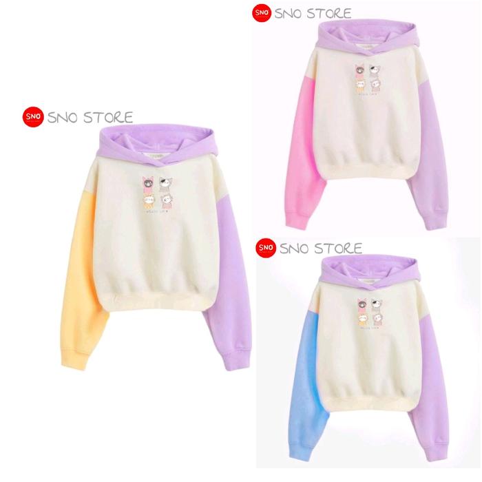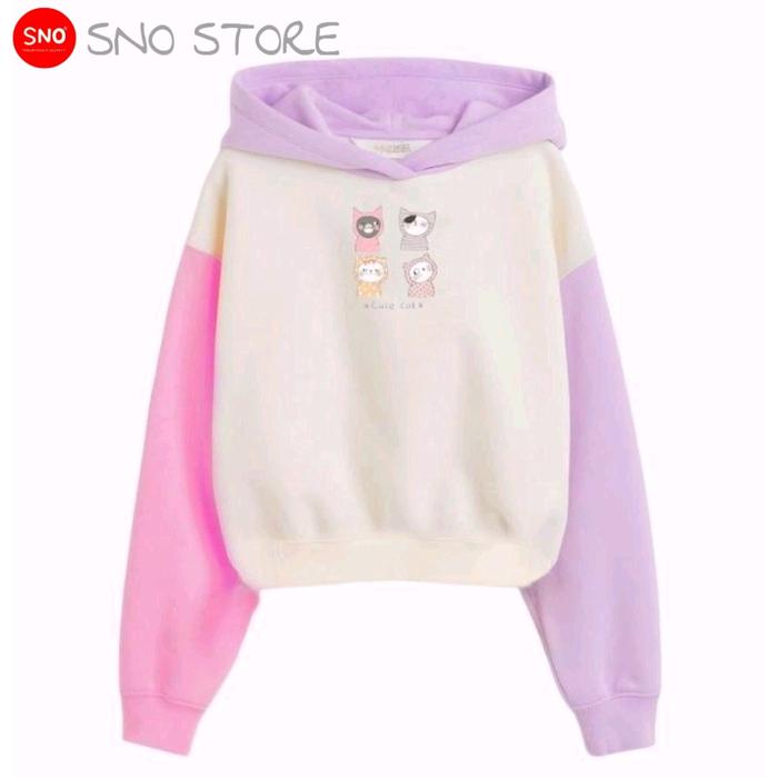 TERLARIS HOODIE CROP BIG SIZE CAT LOVER CUTE MEAW MEOW MIX COLOR KOMBINASI WARNA LUCU LILAC CREAM PINK YELLOW BABY BLUE
