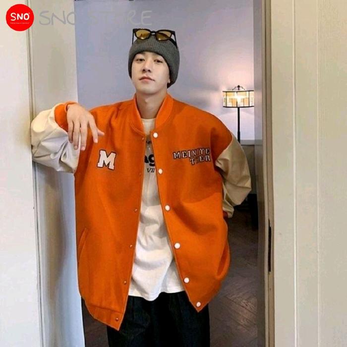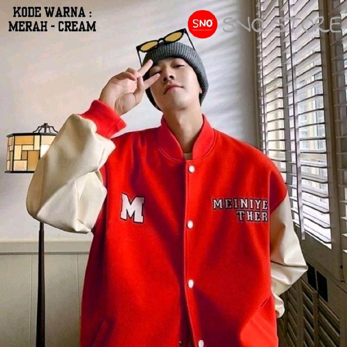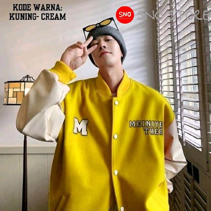 TERLARIS VARSITY BASEBALL BIG SIZE ( S 6XL ) M LOGO FULL COLOR JAKET BISBOL BOMBER OVERSIZED FLEECE CARAMEL CREAM BEIGE