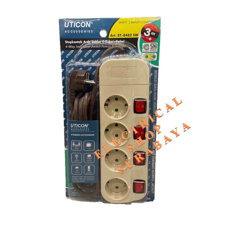 UTICON STOP KONTAK ARDE CP 4 LUBANG ST-8482SW + SAKLAR KABEL 3M (GROSIR) TERMINAL KONTAK KUNINGAN ST 8482 SW 3 M METER 2P 4LUBANG LOBANG