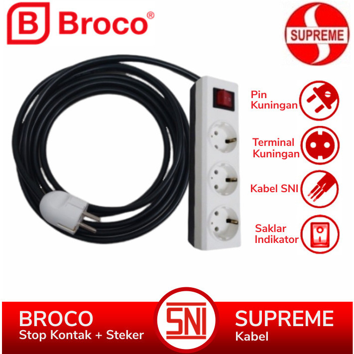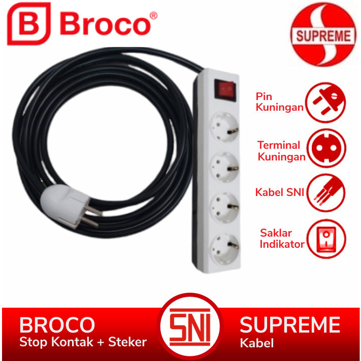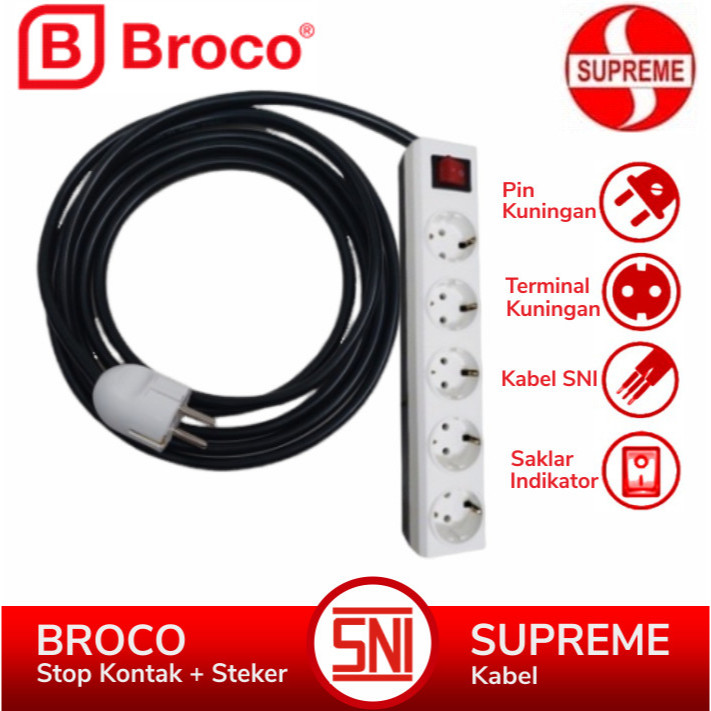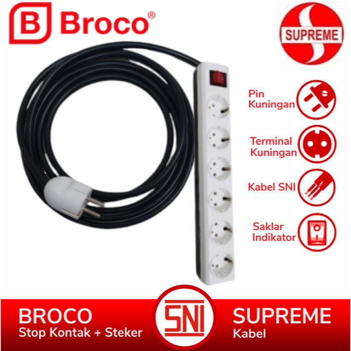 BROCO STOP KONTAK 3 - 4 - 5 - 6 LUBANG EXTENSION KABEL HITAM SUPREME 1 - 10 METER SAKLAR LAMPU INDIKATOR SNI