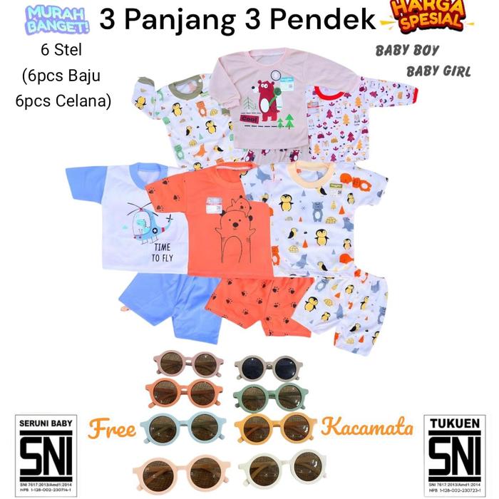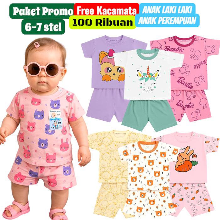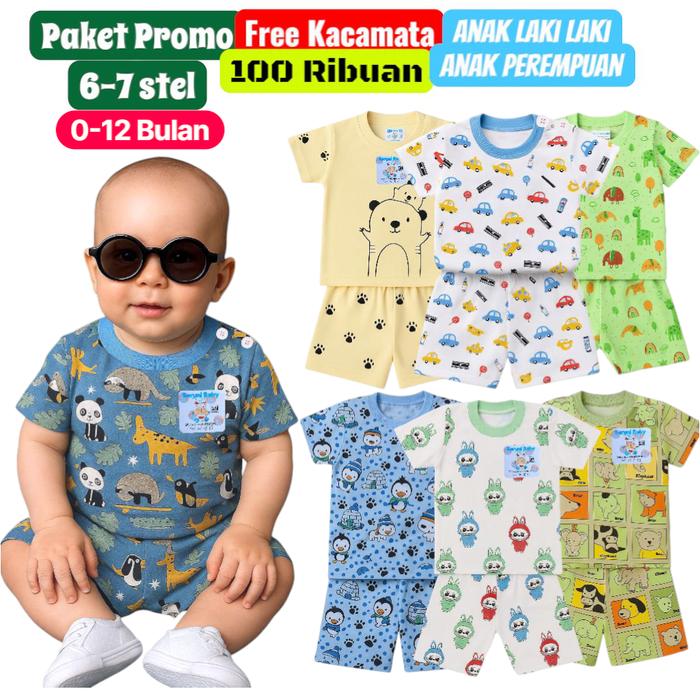 PAKET SETELAN (isi 6-7 pcs) BAJU BAYI 0-12 BULAN MIX MOTIF Cewe dan Cowo FREE KACAMATA Bunda Parsel