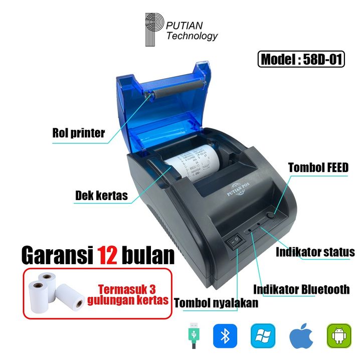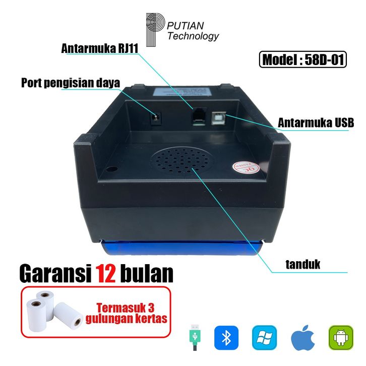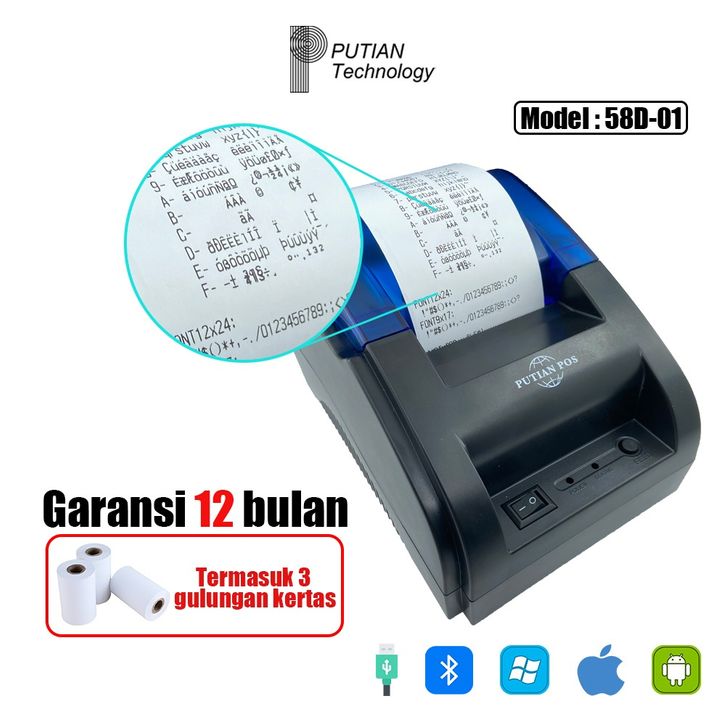 Mini Thermal Printer PUTIAN POS Printer Bluetooth Termal 58D-01 Kasir Printer Mini Portabel/Dukungan PPOB Bluetooth+USB