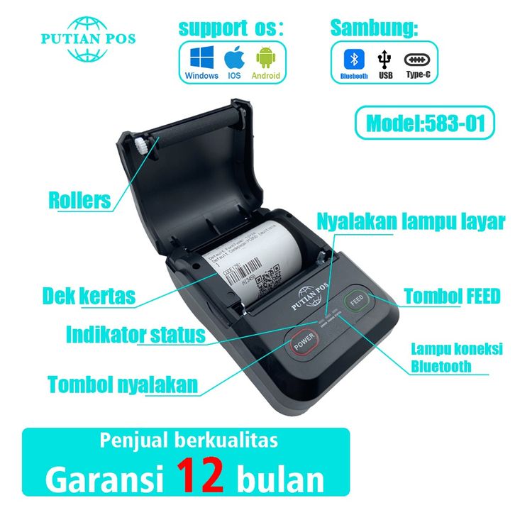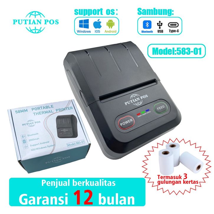 Mini Thermal Printer PUTIAN POS Portable Mini 58mm Bluetooth Thermal Printer 583-01printer kasir dengan baterai