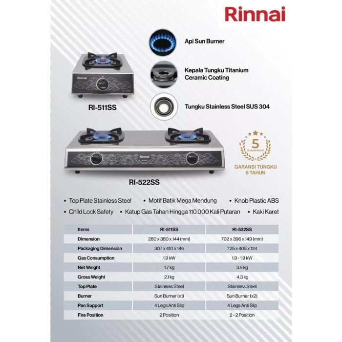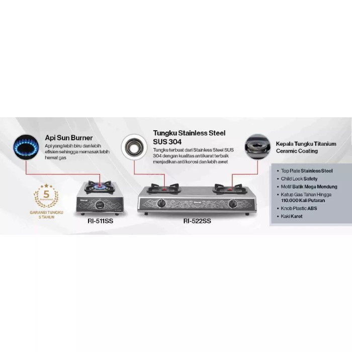 Kompor Gas Rinnai 2 Tungku Stainless Motif Batik RI 522SS
