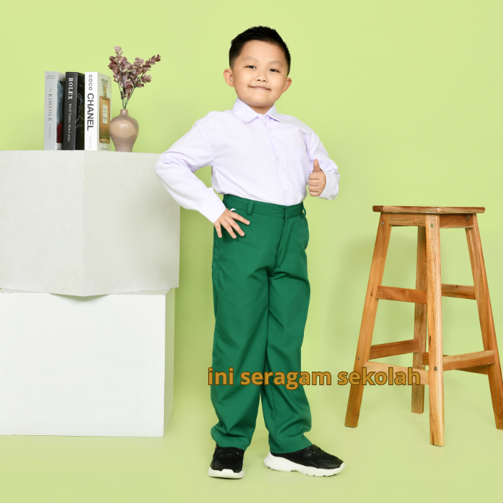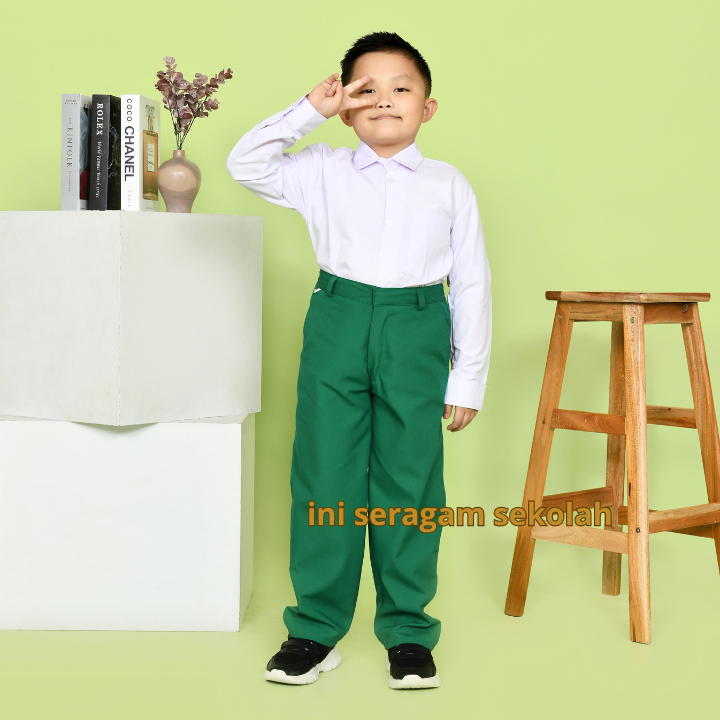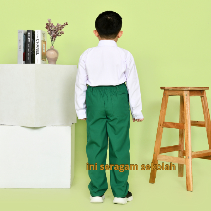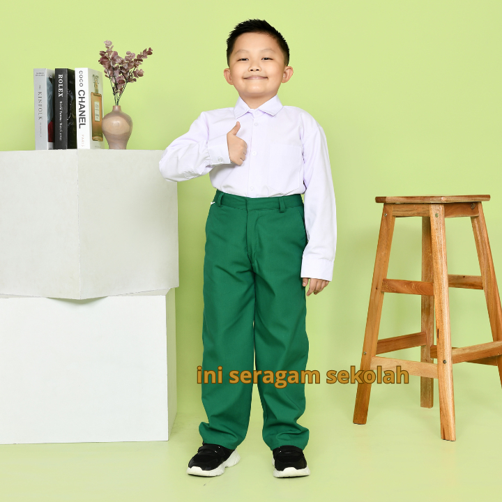 Setelan Seragam Baju sekolah Putih Celana Hijau SD MI Lengan Panjang