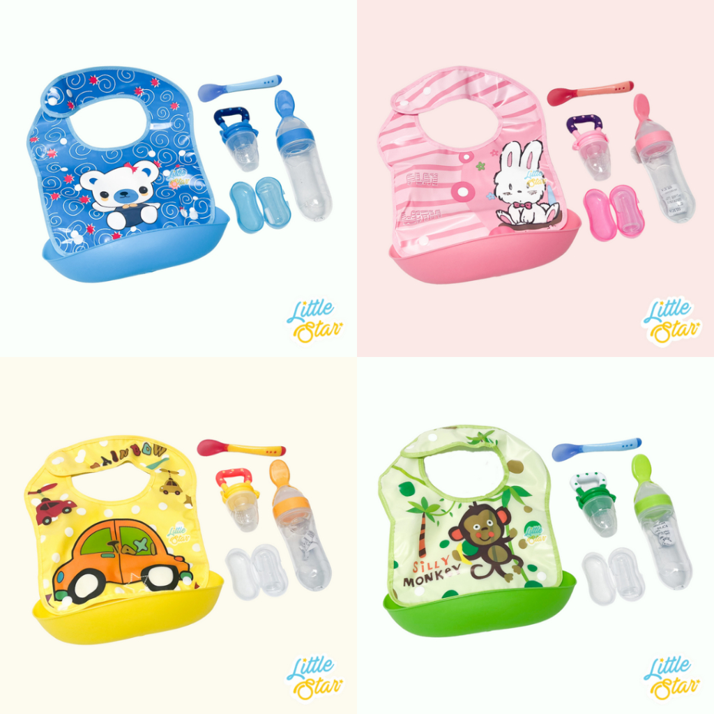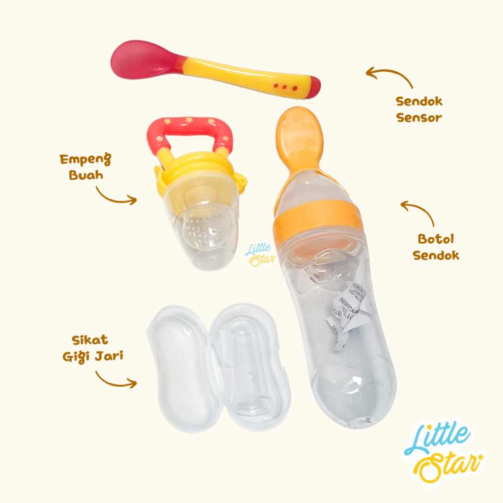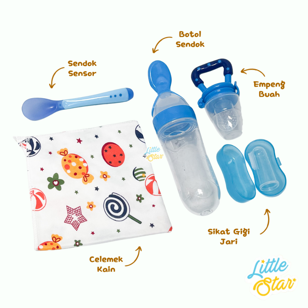 LS Paket Perlengkapan Makan Mpasi Bayi 5in1 Sendok Botol Sensor Celemek Slabber Silicone Baby Feeder Empeng Buah Sikat G