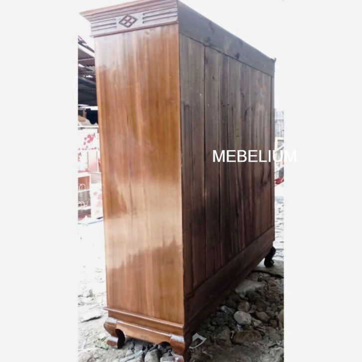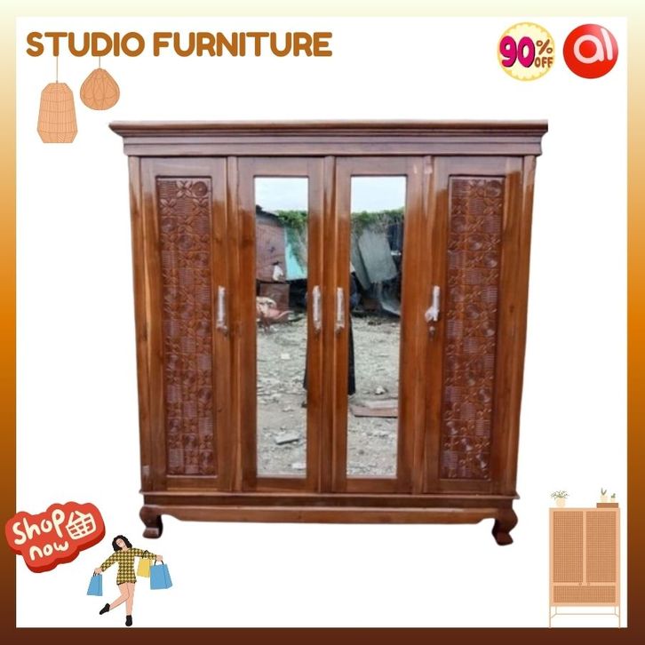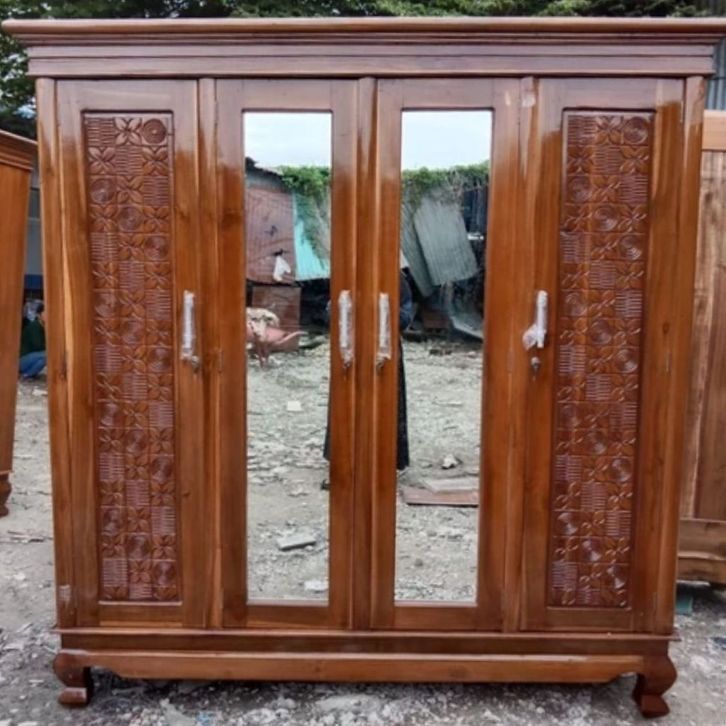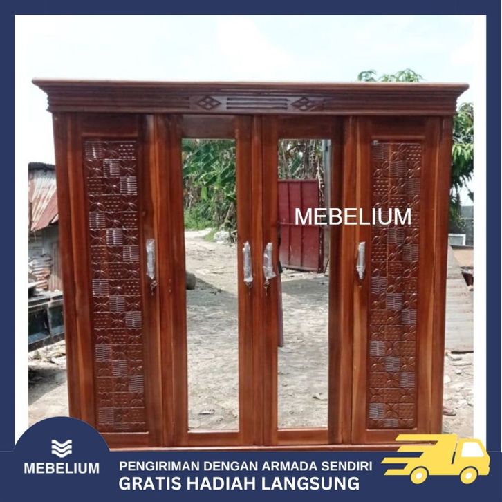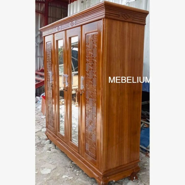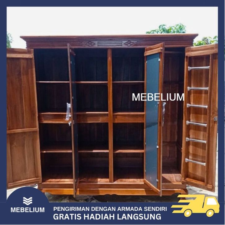 Lemari Pakaian Jati Rak Hijab 4 Pintu / Lemari Baju Kayu Jati Muda Full Rak Hijab Stainless Anti Air Anti Rayap Mebelium