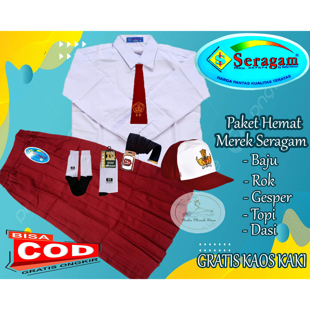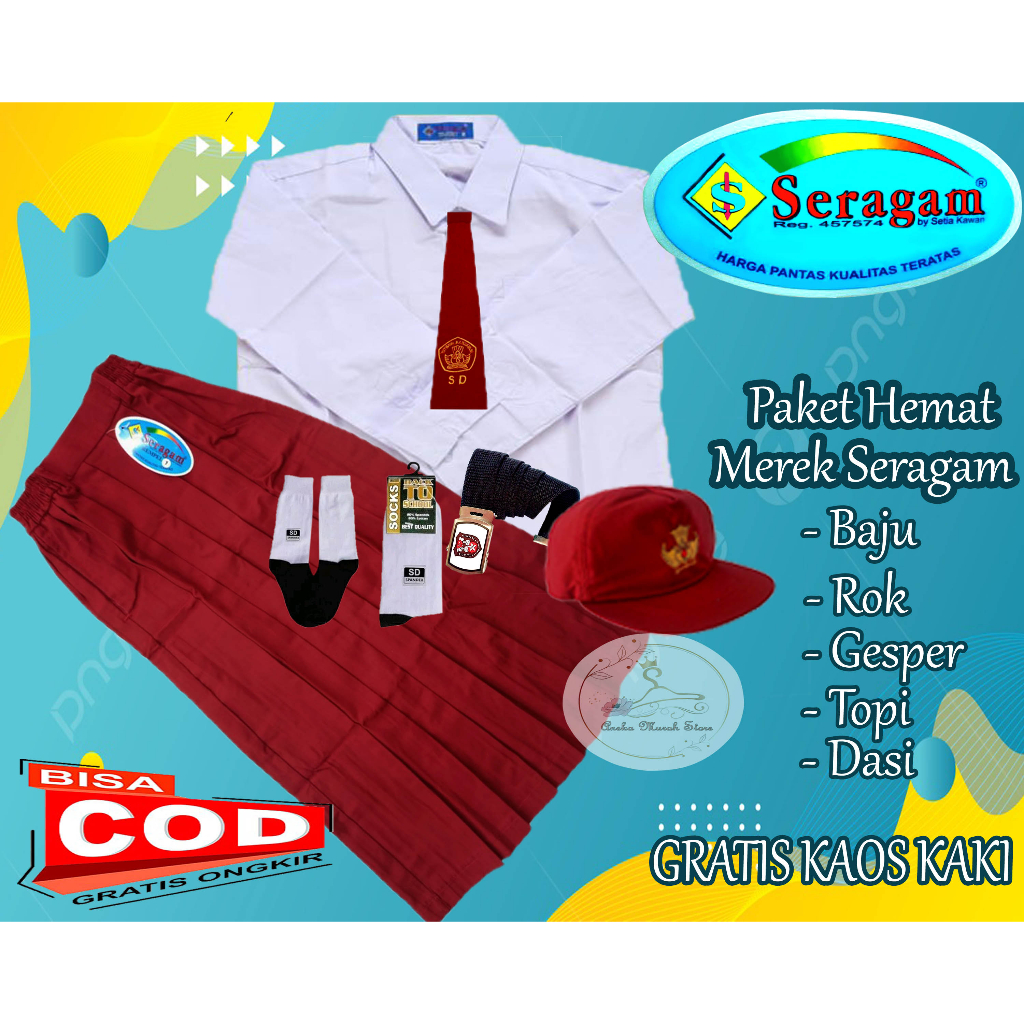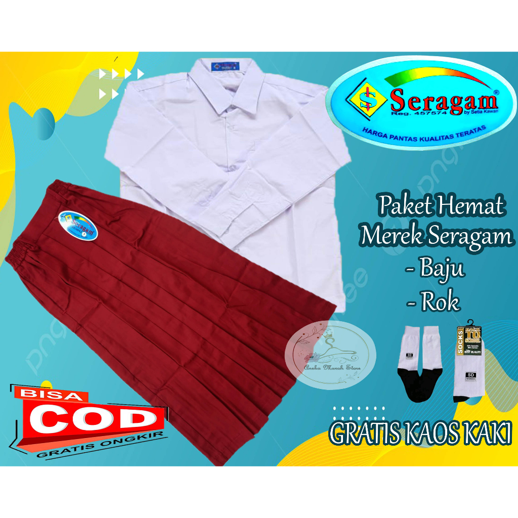 SETELAN PAKET HEMAT SERAGAM SEKOLAH SD LENGAN PANJANG POLOSAN + BED BORDIR ROK REMPEL PANJANG MEREK SERAGAM