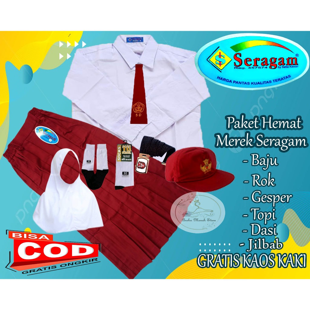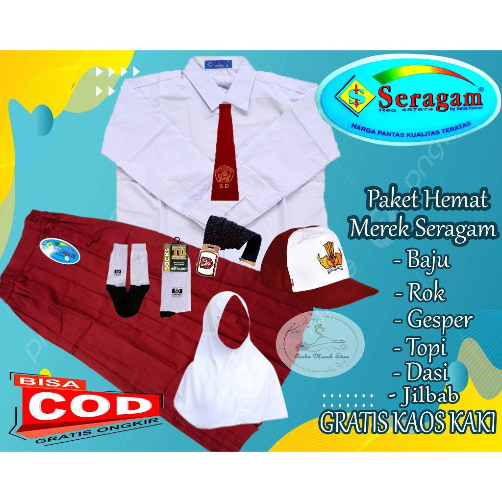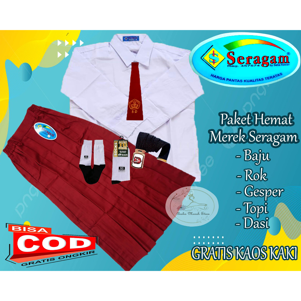 SETELAN PAKET HEMAT SERAGAM SEKOLAH SD LENGAN PANJANG POLOSAN + BED BORDIR ROK REMPEL PANJANG MEREK SERAGAM