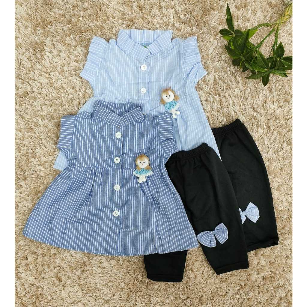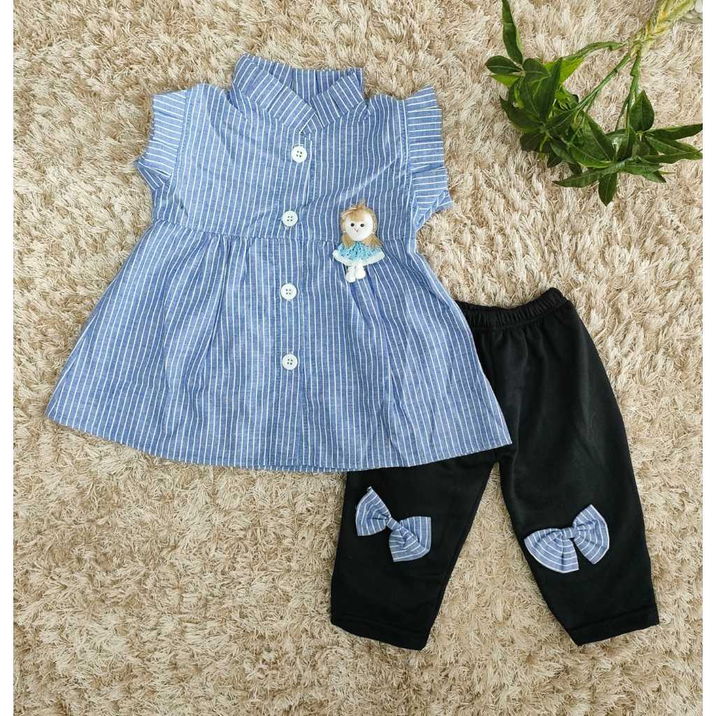 Setelan Baju Anak Perempuan / Baju Bayi Cewek Atasan Lengan Pendek Dan Celana Panjang Motif Calista Garis