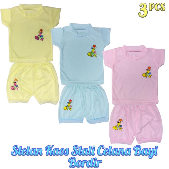 Promo 3 Setelan Kaos Stali bayi celana pendek bordir laki perempuan kaos oblong hemat murah Promo