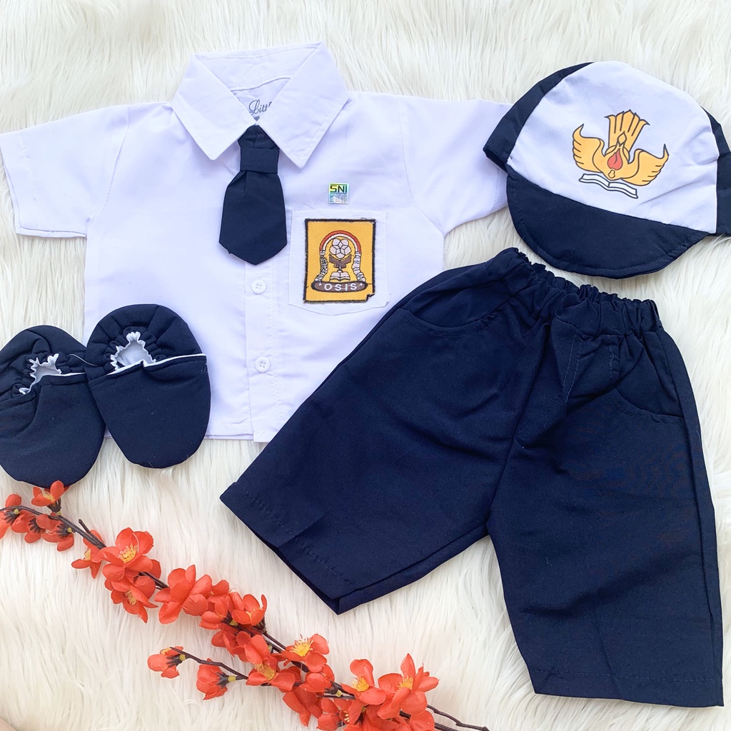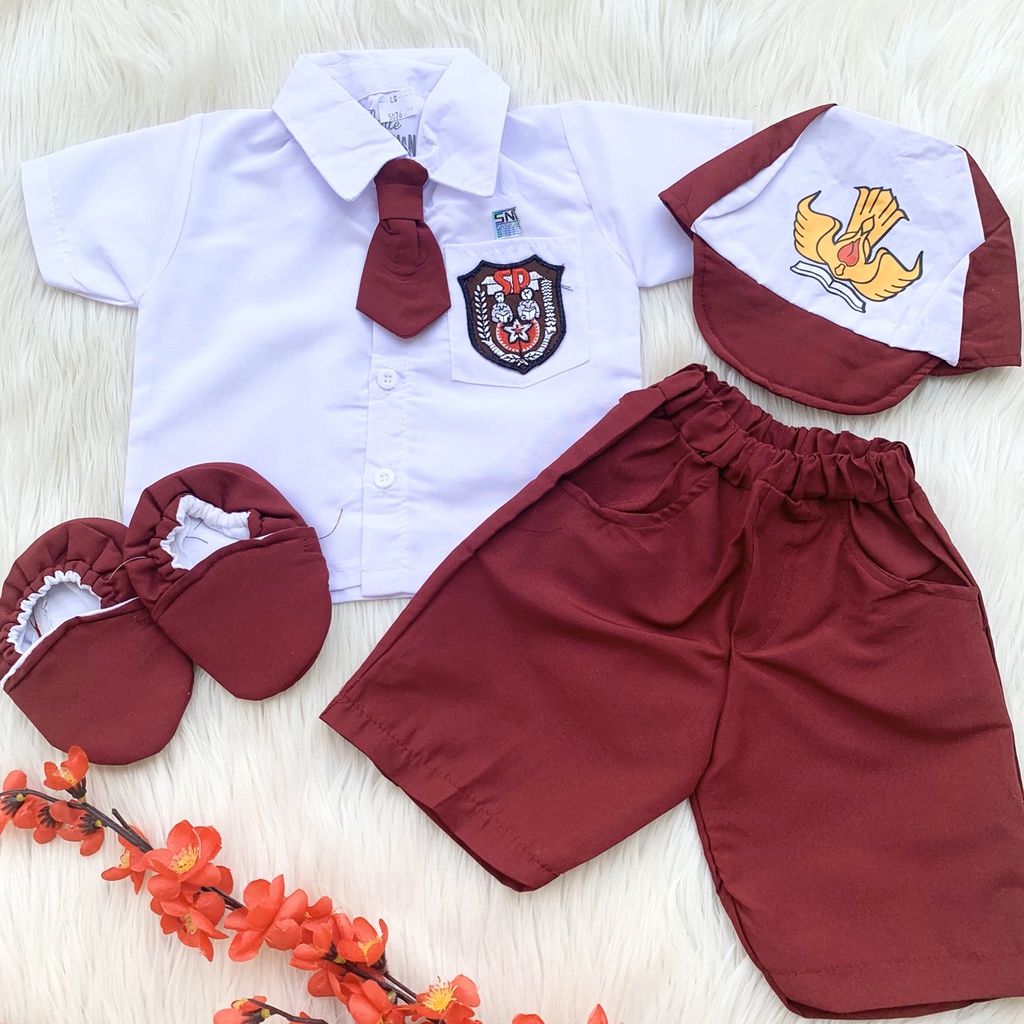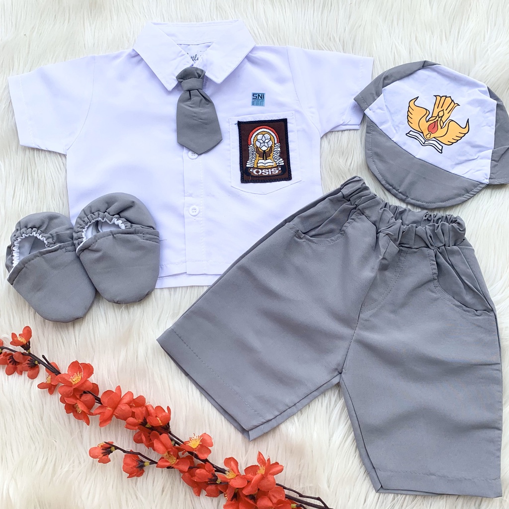 Baju setelan kemeja celana topi dasi sepatu keren motif seragam sekolah lucu fashion anak bayi cowok laki lucu -uniboy
