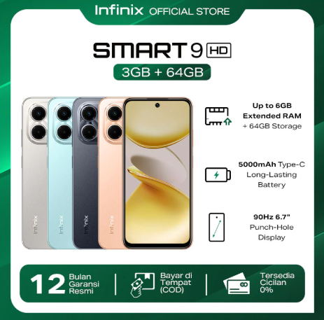 Infinix Smart 9 HD 3/64GB - Up to 6GB Extended RAM - 6.7 inch 90Hz Punch Hole Display - Helio Octa Core - 5000 mAh
