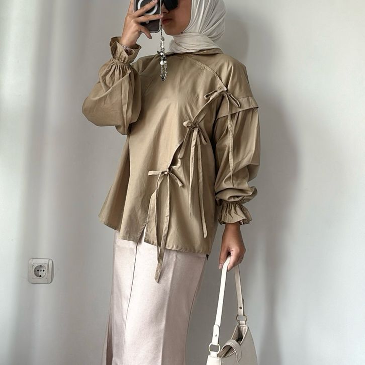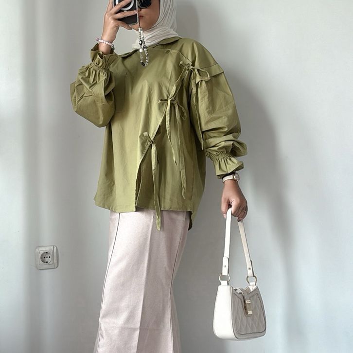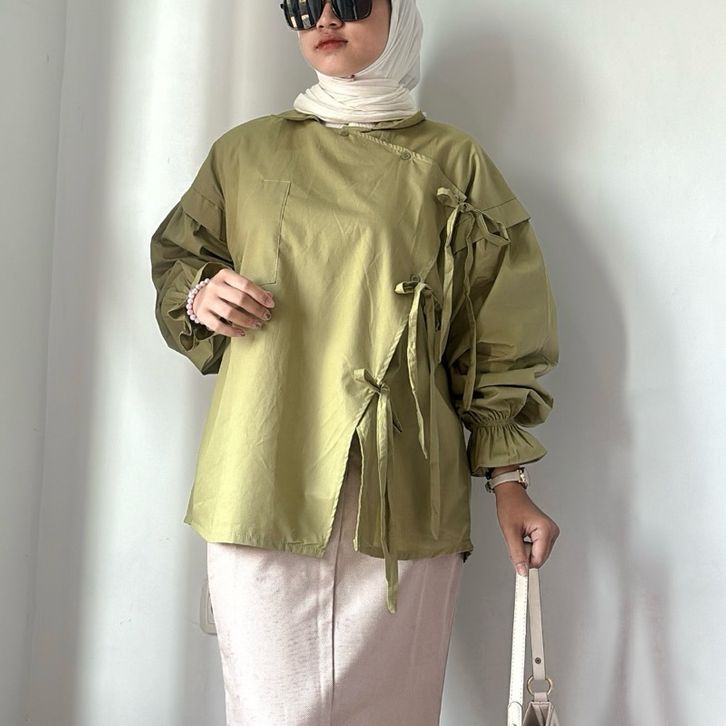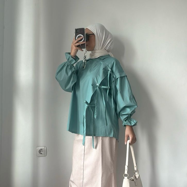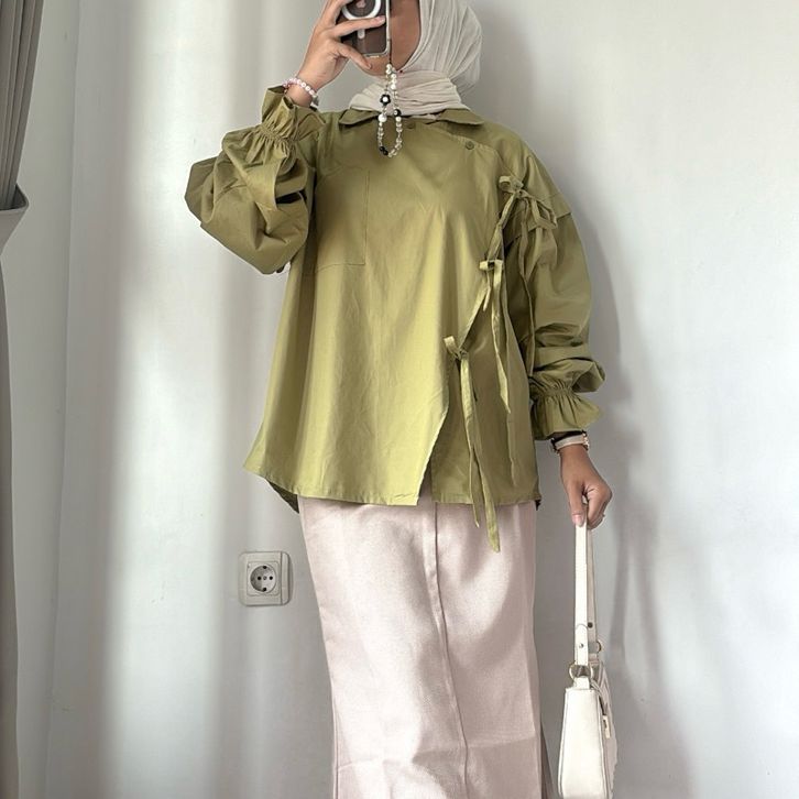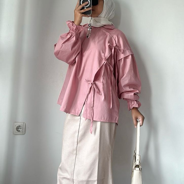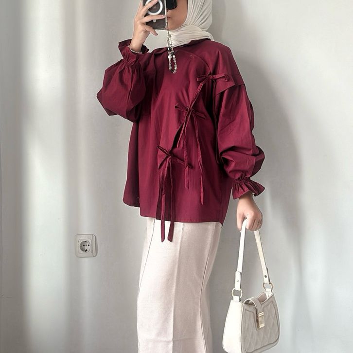 Kemeja Katun Wanita Lengan Panjang Poplin Pita Tiga Burgandi Baju Cewek Kekinian Ootd Atasan Elegan