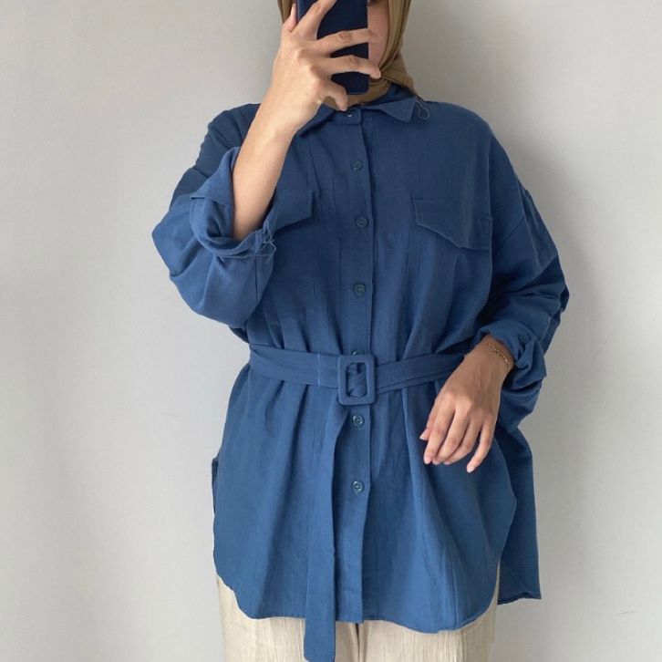 Baju Cewek Lengan Panjang Remaja Kemeja Linen Belt Wanita Hijab Oversize Minimalis Atasan Muslim Wanita Terkini